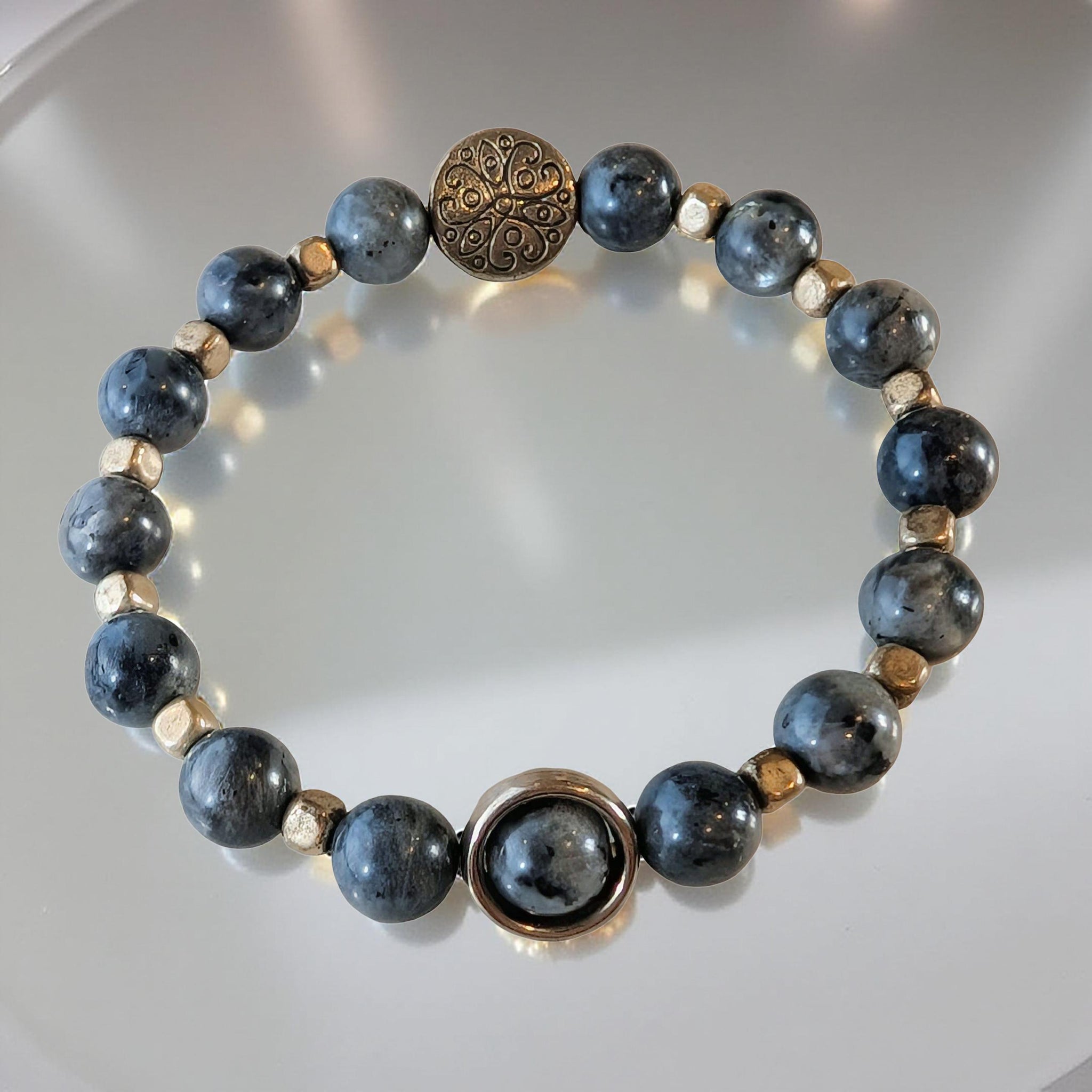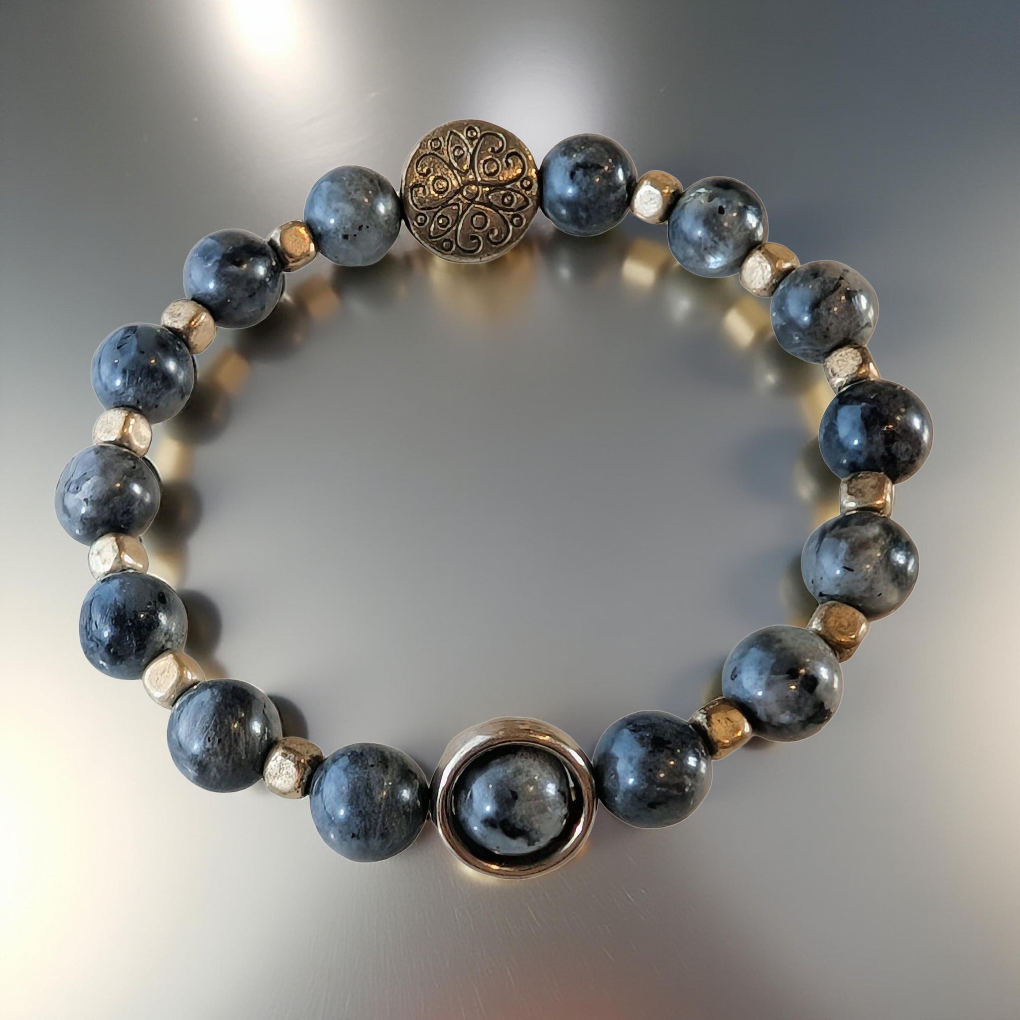 • The Stone: Natural Larvikite beads with captivating flashes of silver and blue.