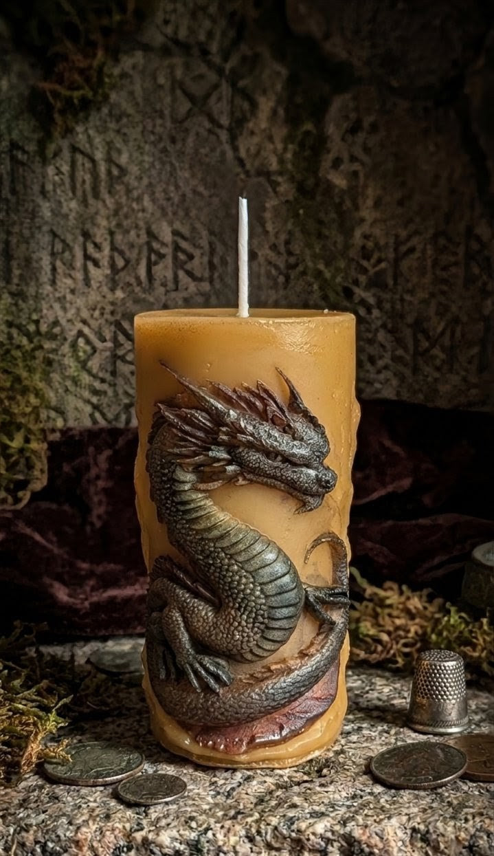 Bring a touch of ancient myth into your home with our latest artisanal creation. This pillar candle features a majestic dragon intricately coiled around its surface, symbolizing protection, power, and wisdom.