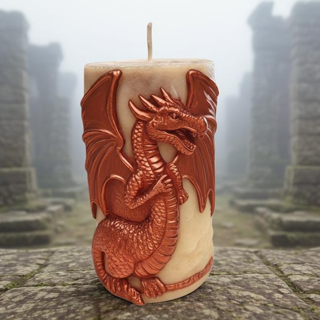 This stunning pillar candle features a majestic dragon captured in mid-stride, its wings swept back to follow the natural curve of the wax. Hand-painted with meticulous detail, the dragon is finished in a vibrant, metallic copper using food-grade candle powder. This ensures a safe, clean burn without sacrificing its brilliant, fiery luster.