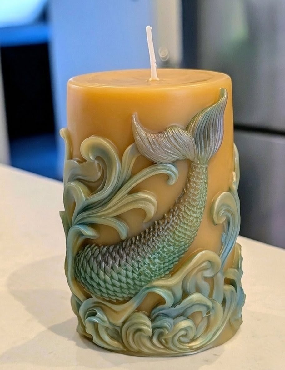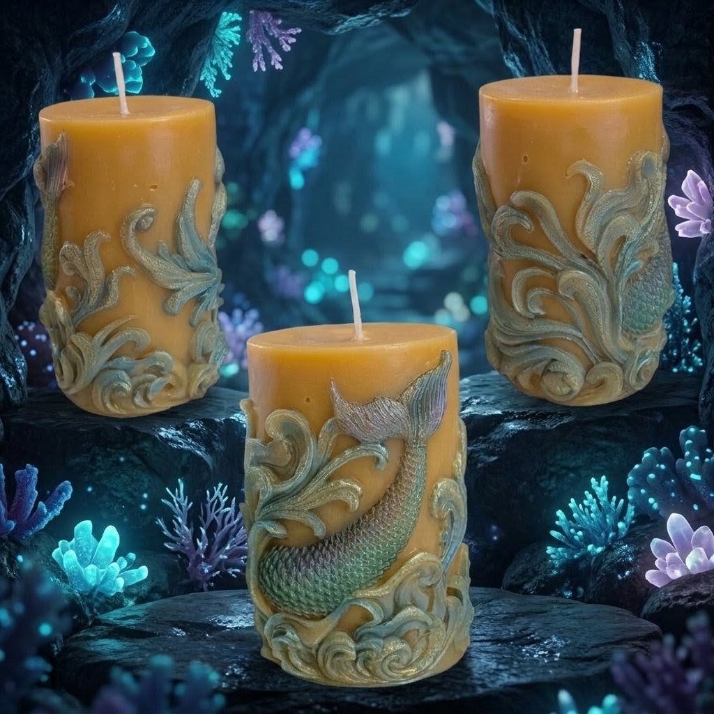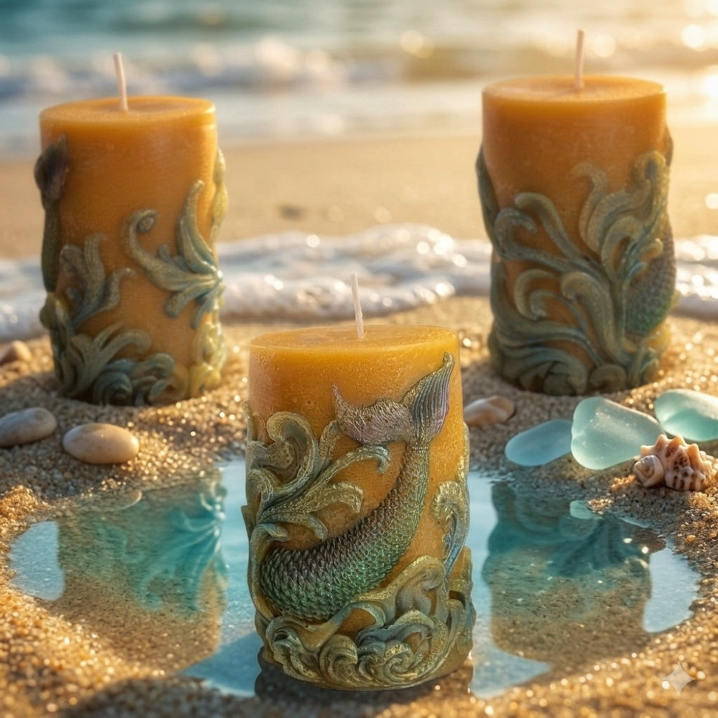 A hand-finished relief pillar featuring a beautifully detailed mermaid tail emerging from iridescent sea foam and cresting waves. Each scale is highlighted with shimmering mineral micas that dance like sunlight on the tide, perfectly complementing the natural, golden glow of the wax.
