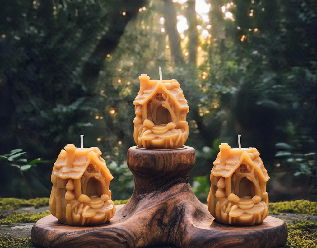 Bring a touch of magic into your home with this one-of-a-kind ornamental keepsake. This intricately detailed candle is hand-poured using 100% organic beeswax, showcasing a charming fairy cottage complete with a peaked roof, tiny chimney, and a welcoming arched doorway.