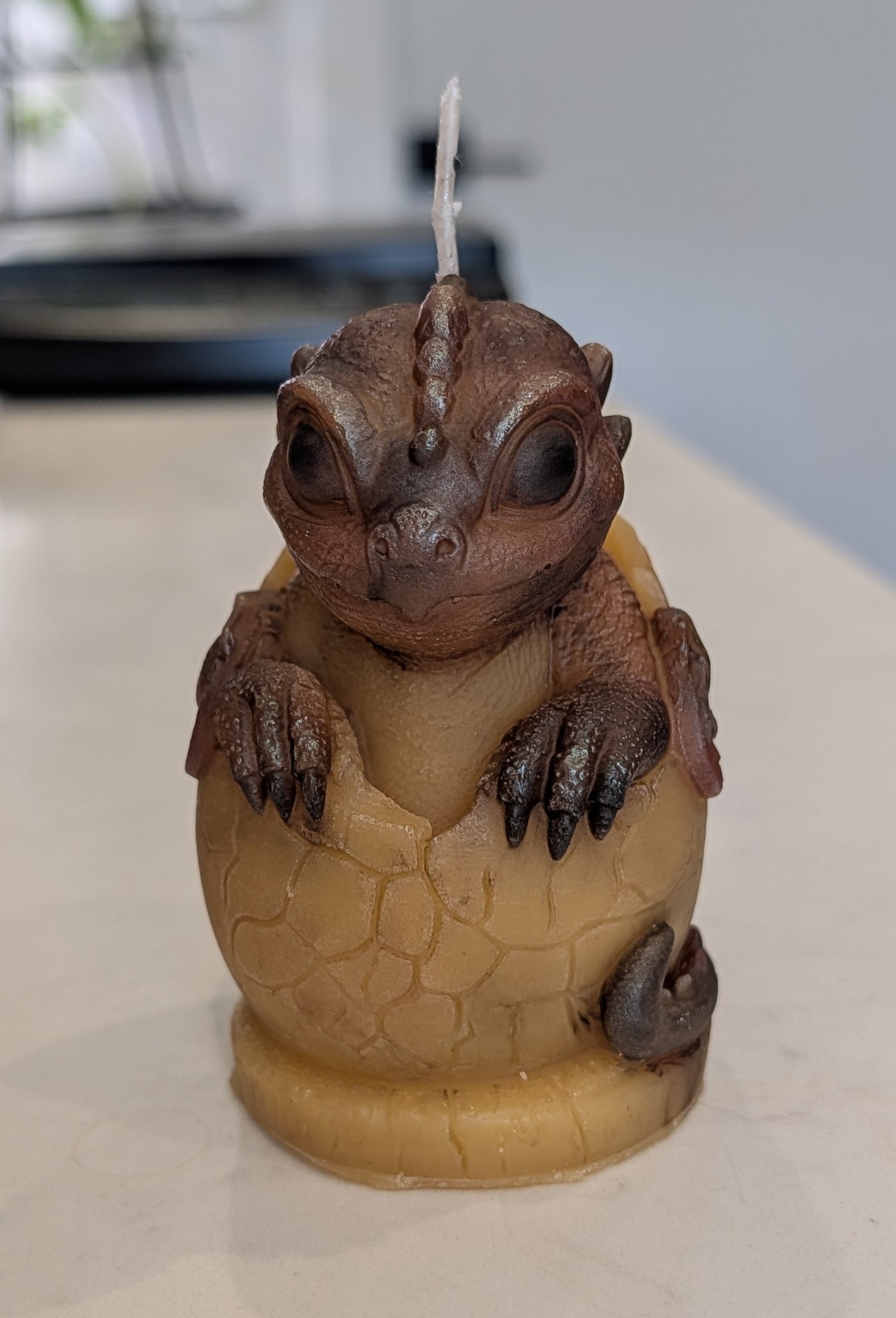 The artistry of this piece is highlighted by its rich, earthy palette. The hatchling is finished in deep chocolate and chestnut browns, with hand-painted highlights that accentuate its textured scales and crest. Its large, soulful eyes are finished in a striking obsidian black, giving it a remarkably lifelike gaze. The dragon emerges from a warm, cream-colored egg featuring realistic "cracked" detailing and soft amber lowlights, perfectly complementing the natural golden hue of the organic wax.
