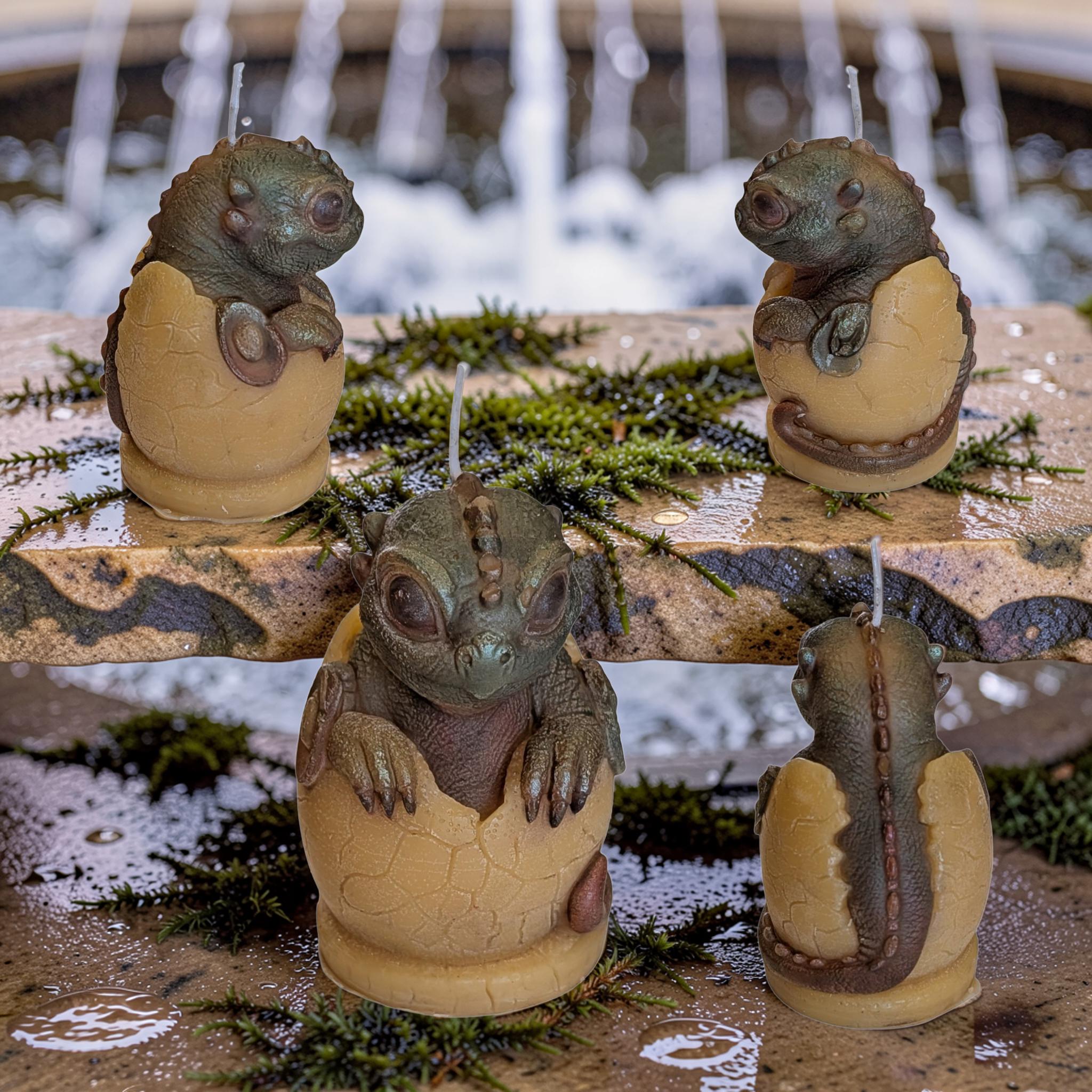 Witness the moment a legend begins. This one of a kind, hand-poured organic beeswax candle depicts a dragon hatchling taking its first look at the world from within its ancient, textured shell.