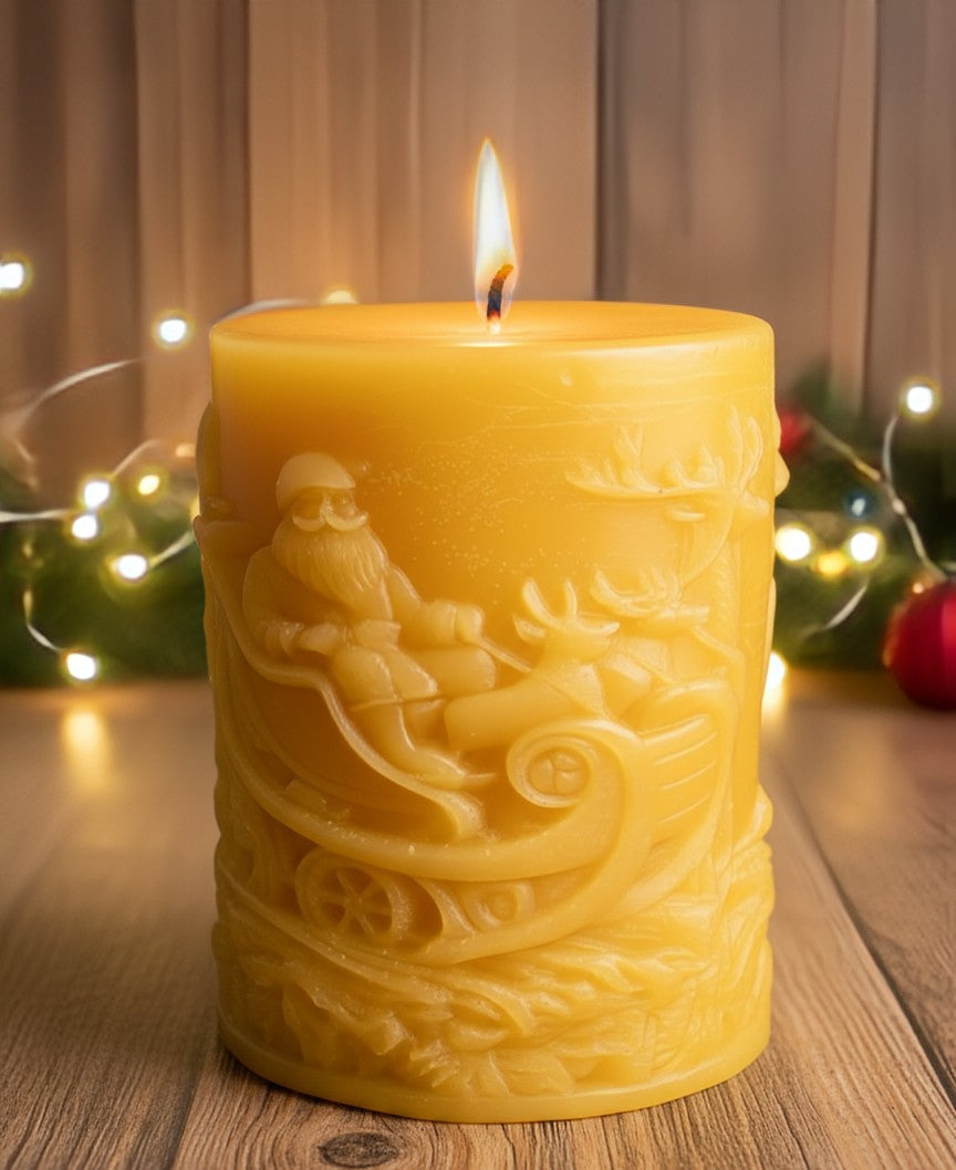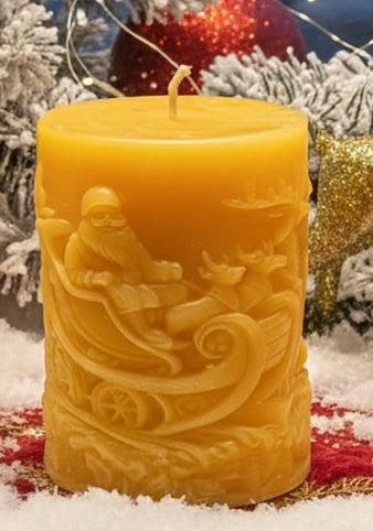 The intricate relief carving features a classic, festive scene: Santa in his sleigh pulled by a reindeer. It is not just a candle; it is a substantial, textured piece of artisanal craftsmanship perfect for your seasonal décor.