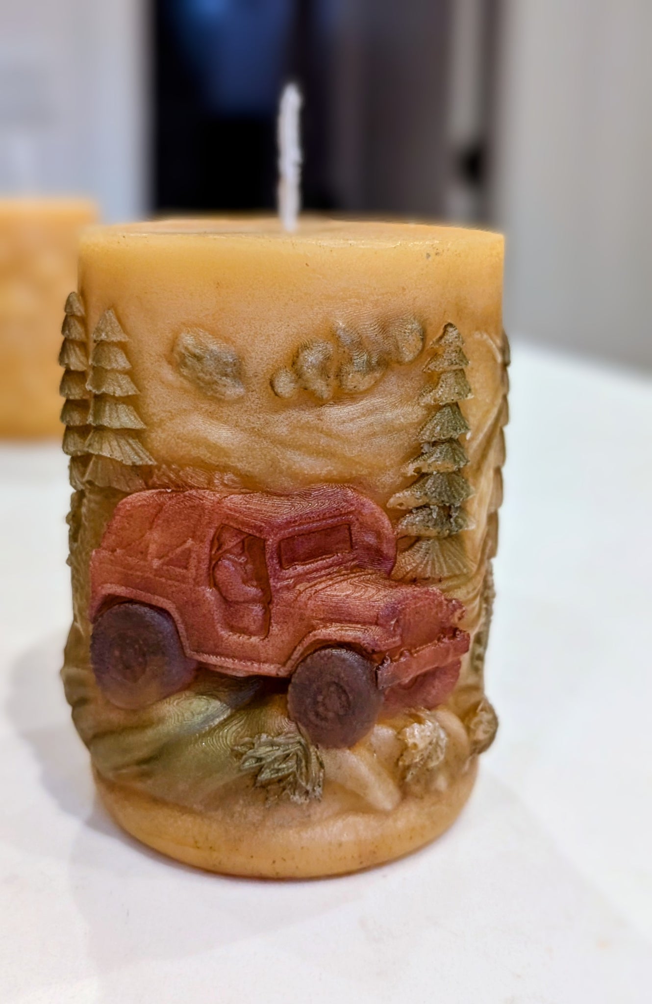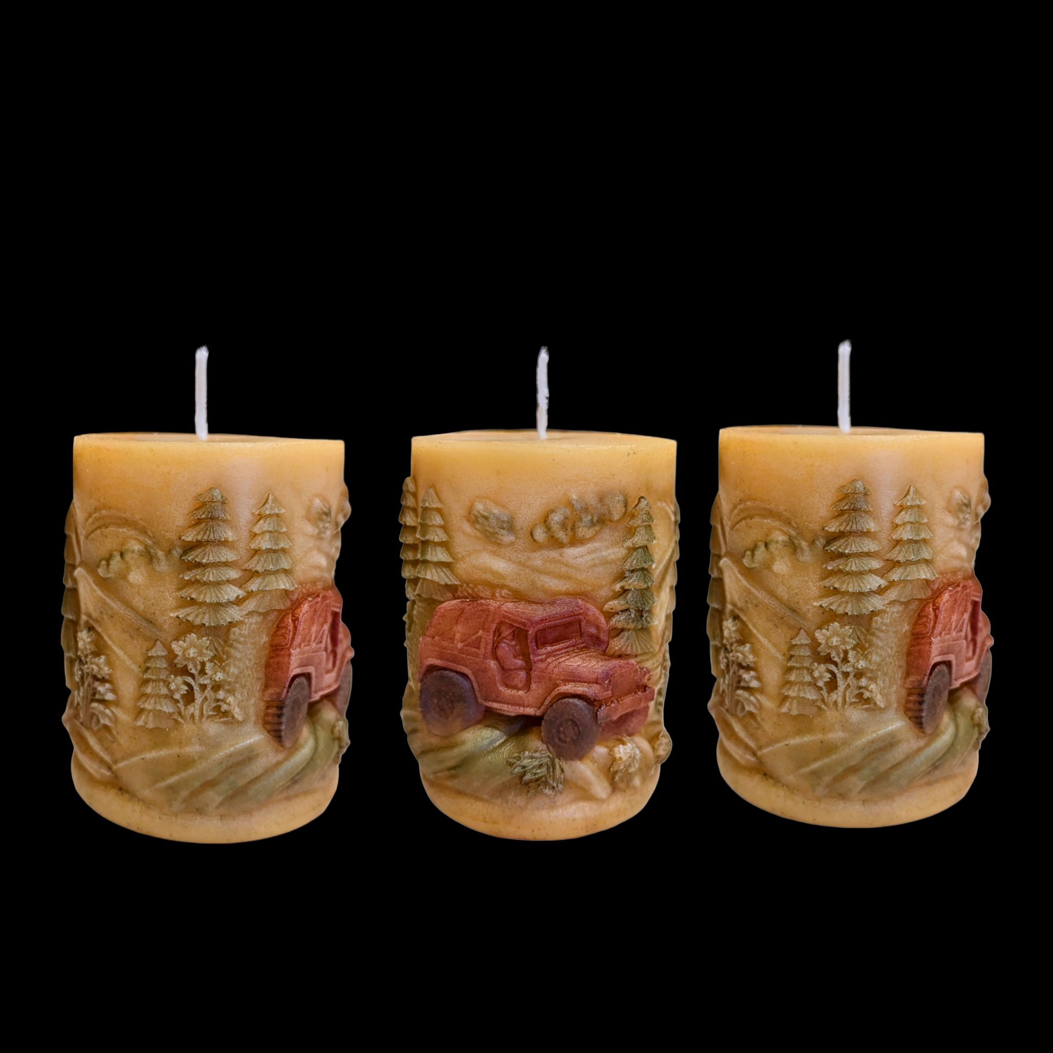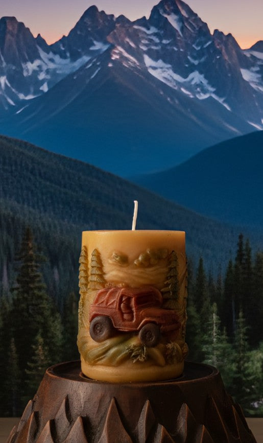 The journey is just as sacred as the destination. This Jeep candle represents the drive to explore the unknown and the strength required to navigate life's rugged paths.