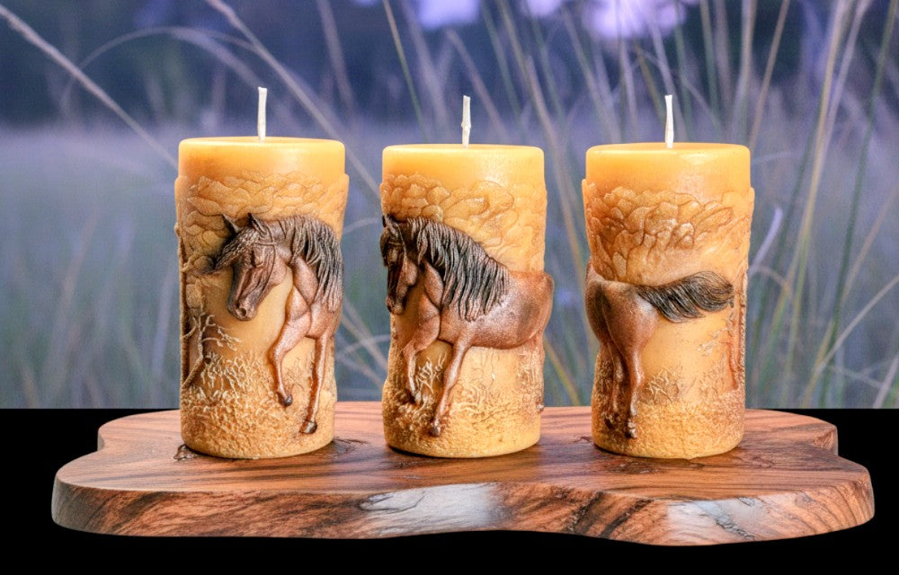This intricate, 360-degree horse pillar features a detailed scene that wraps entirely around the cylinder, showcasing a horse in mid-stride. Naturally scented with the sweet aroma of honey, it provides a long-lasting, clean burn. The meticulous detailing of the mane and landscape is highlighted with a hand-applied bronze-toned luster, creating a sculptural piece of art that reflects the nature-inspired themes found in most Echo of a Stone creations.