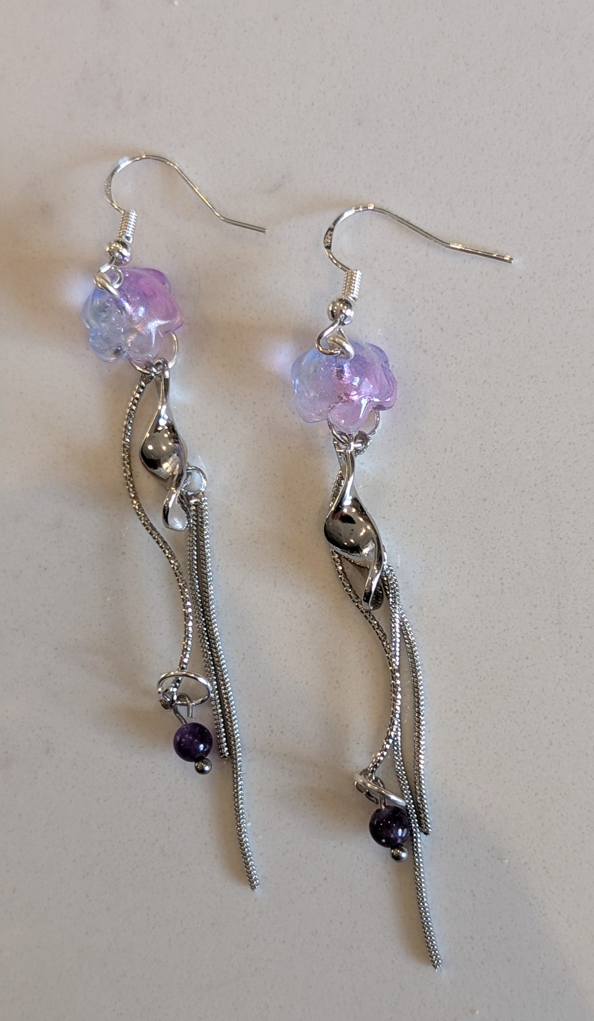 - Size & Movement: Approximately 3 inches in length, featuring translucent purple glass and flowing silver chains that catch the light.