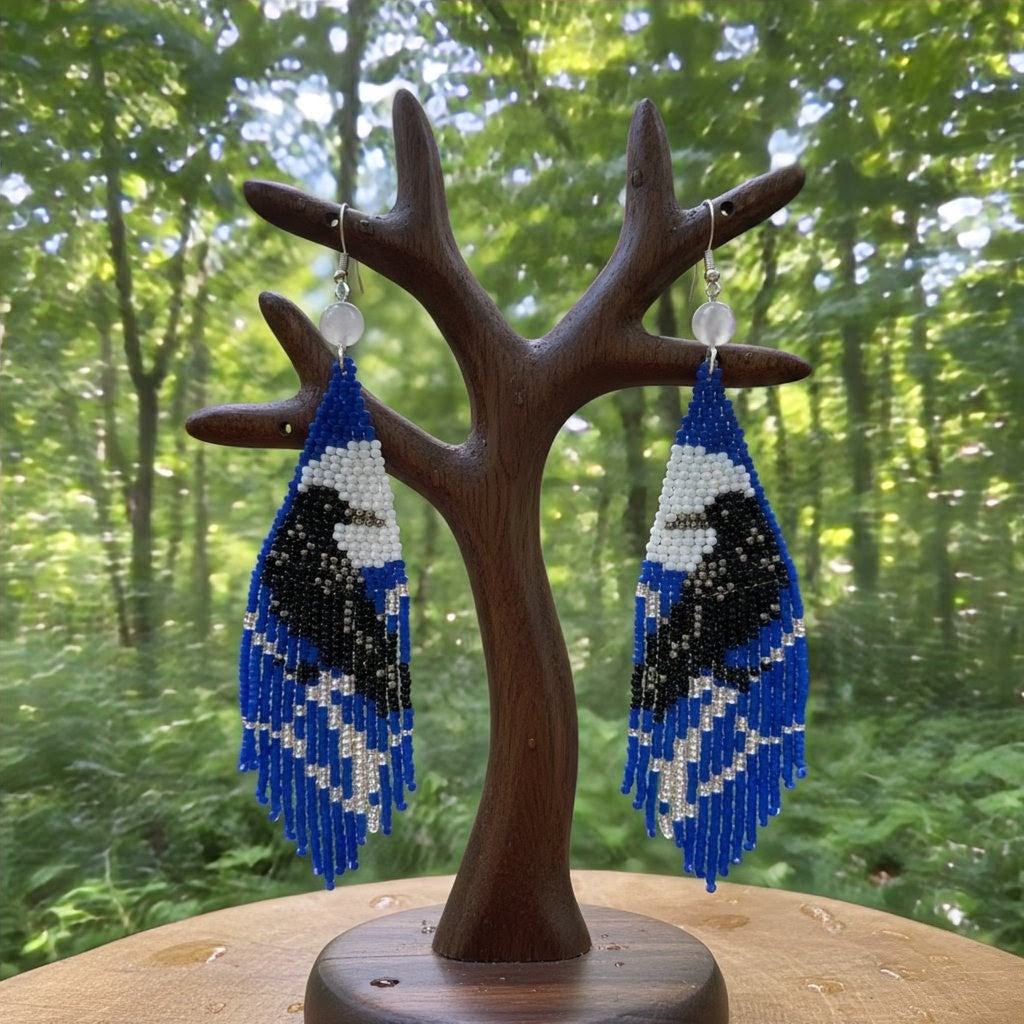 These aren't your average earrings. At 5 inches long, they capture the multifaceted wisdom of the raven through intricate beadwork in shades of midnight black, snow white, and electric blue.