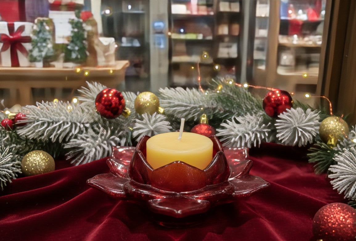 Made from dark translucent red resin with shimmers of green, its five-inch petals beautifully diffuse the light from the included hand-poured 100% organic beeswax 1.5 Inch candle. Watch the light shine through the material, creating a stunning and peaceful festive ambiance.