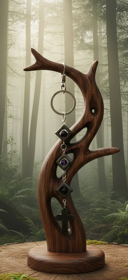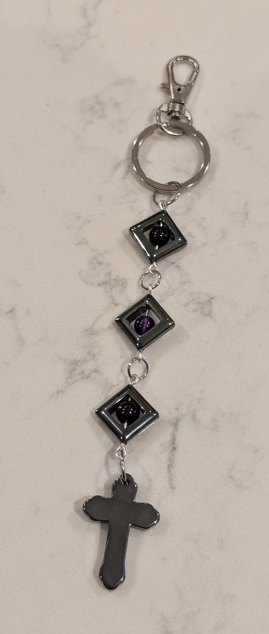 Our One-of-A-Kind keychain design features the striking contrast of metallic hematite and deep purple amethyst. Hematite is the ultimate grounding stone, helping to keep you centered, while amethyst provides a touch of peace and clarity for your daily journey.