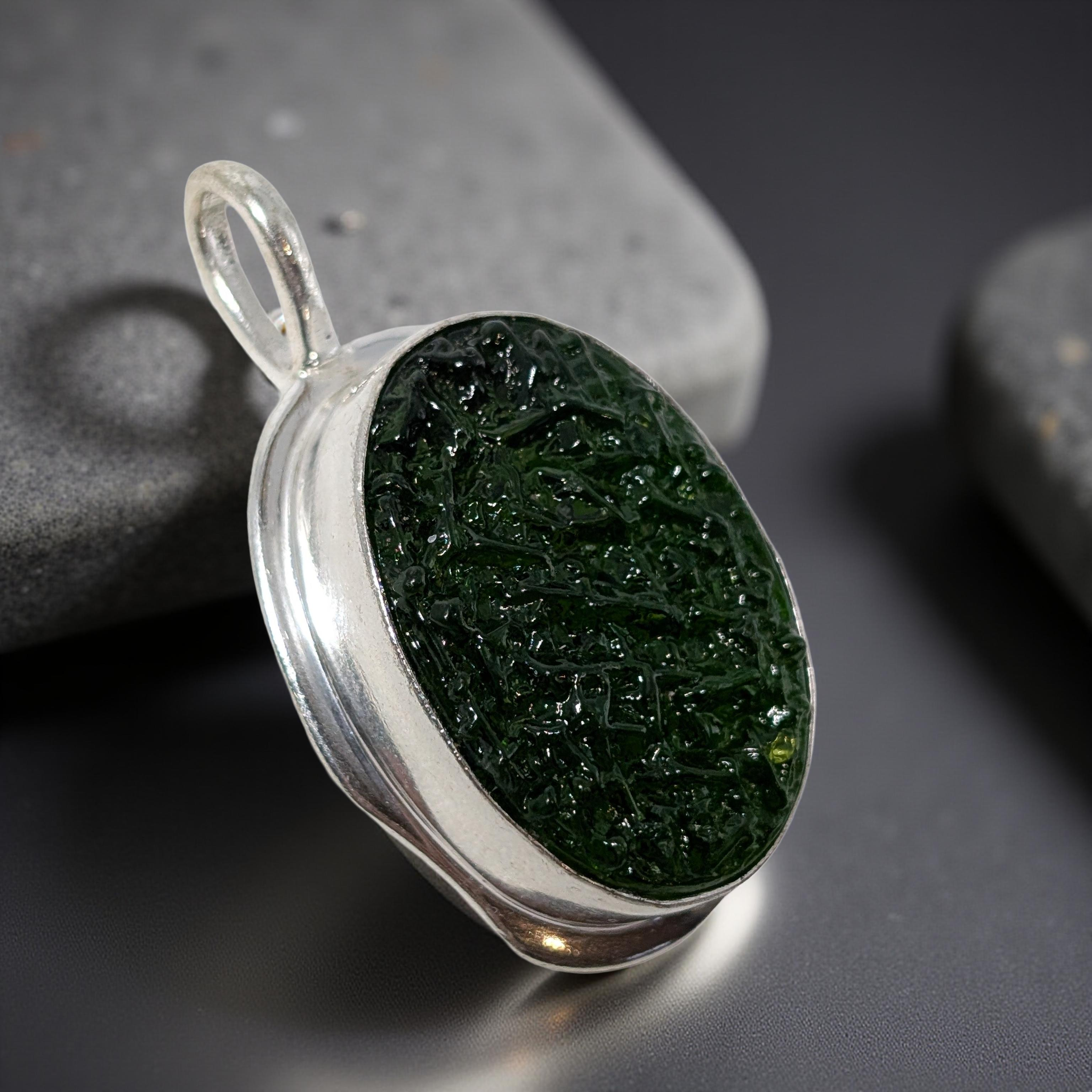 A stunning, handcrafted 1.9 inch moldavite ( 18 grams) specimen, elegantly set in a timeless 925 sterling silver design.