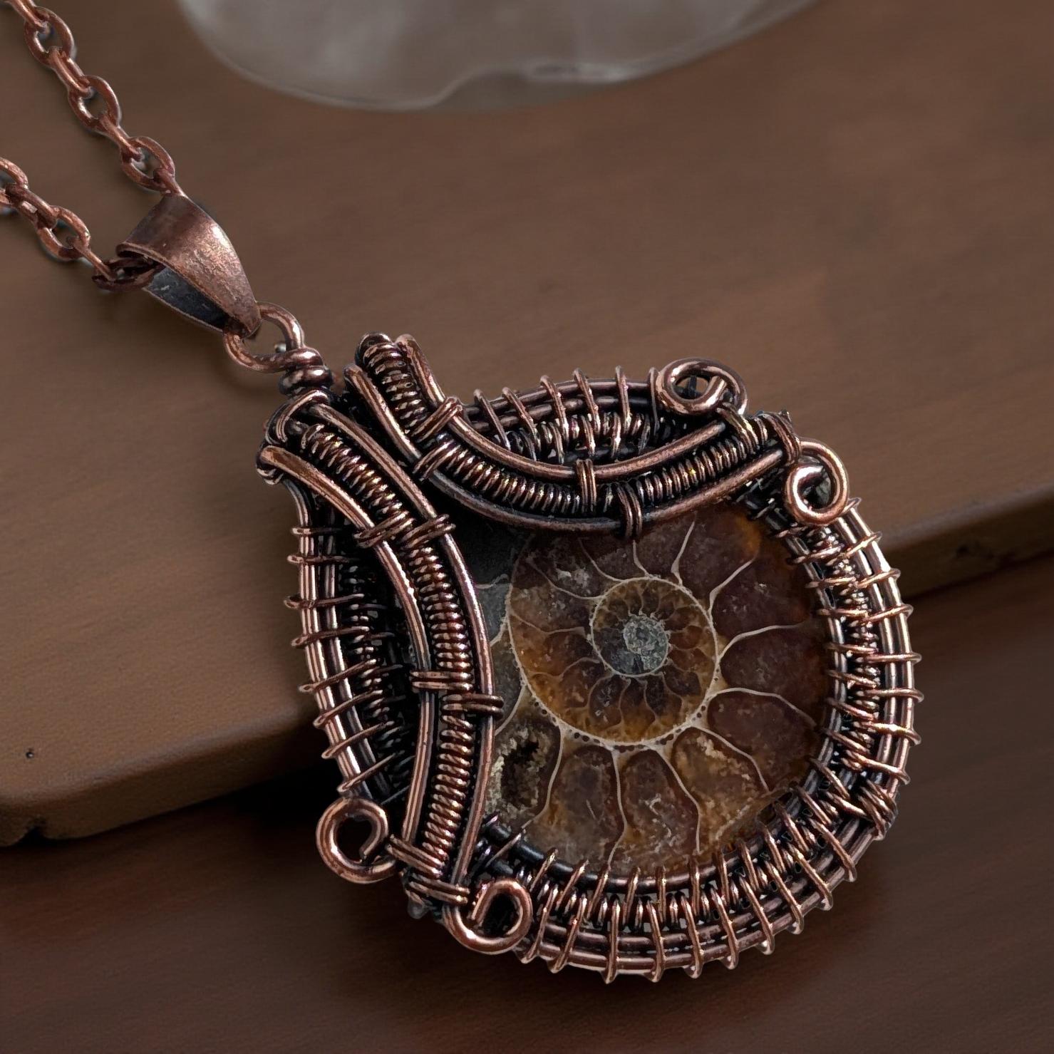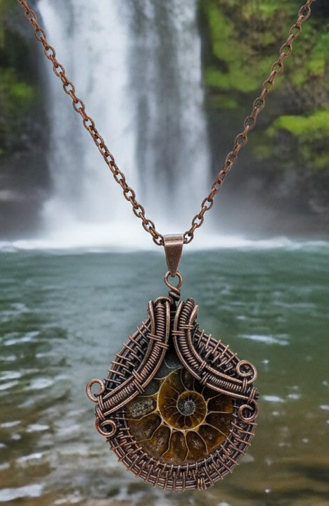 A story is told in copper and stone. The "Ancient Embrace" pendant begins with a rich, heavy copper wire, forged into a teardrop shape that seems to cup a piece of the past. Within this frame, a fine, glittering strand dances, weaving a delicate cage that holds a luminous 2-inch ammolite fossil. This is a tribute, a whispered echo of the ancient sea creature whose shell held this very stone. Suspended on a 22-inch chain, this piece is a relic made wearable, a connection to a world we can only imagine.