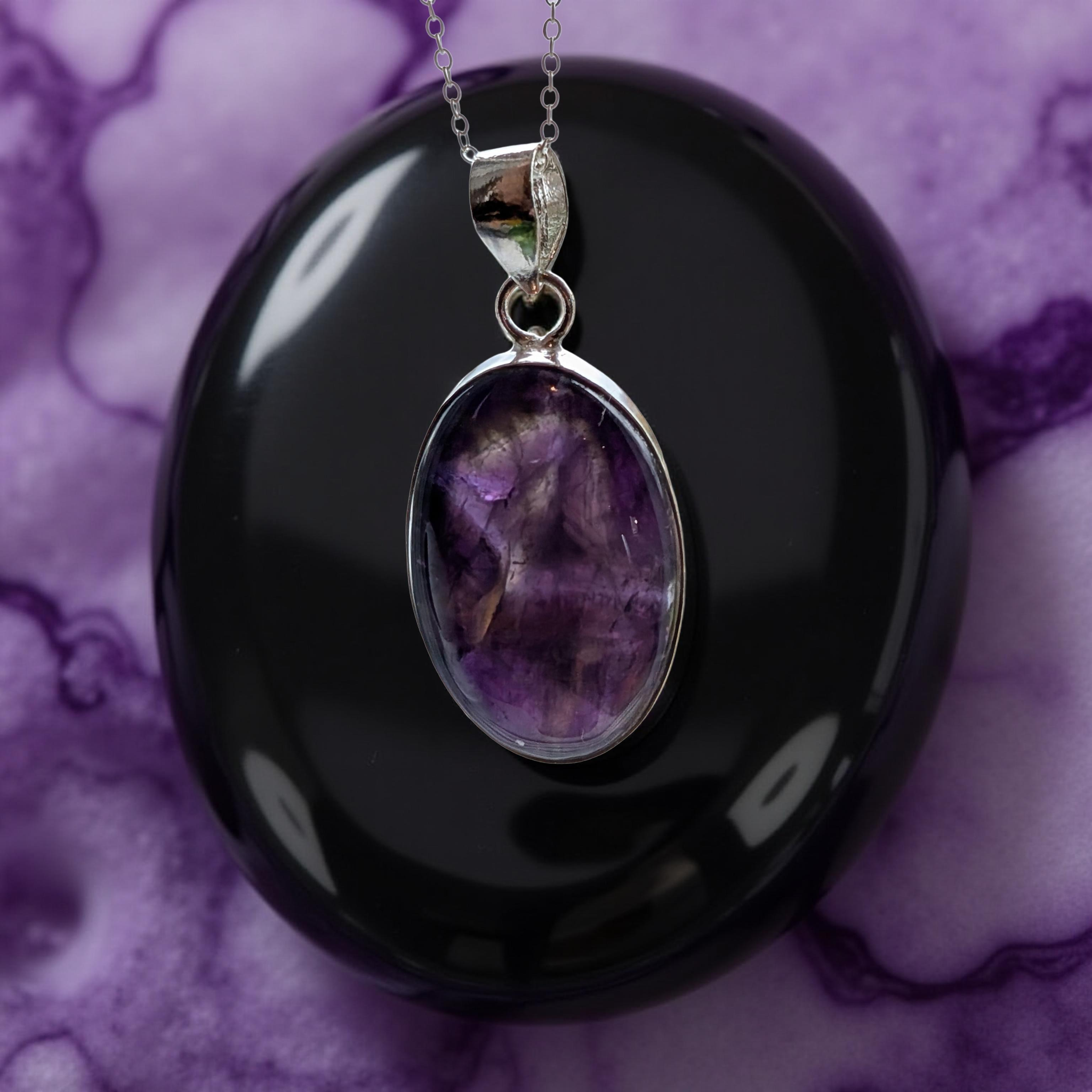 Unveil your personal haven with this Deep Calm Pendant. It features a superb, handcrafted, hand-polished, high-quality 2.5 \times 1-inch Amethyst masterwork. Encased in lustrous 925 sterling silver and suspended from a 24-inch chain, this piece serves as an anchor for the soul. Amethyst is the stone of quiet contemplation, a natural artist that sketches stillness into the rush of modern life. Allow the velvet violet depths to clear your mental static, opening the channels of your Third Eye and Crown Chakras. More than an adornment, this crystal is your sanctuary—a tangible moment of peace you can carry. Slip it on and let the tranquility begin.