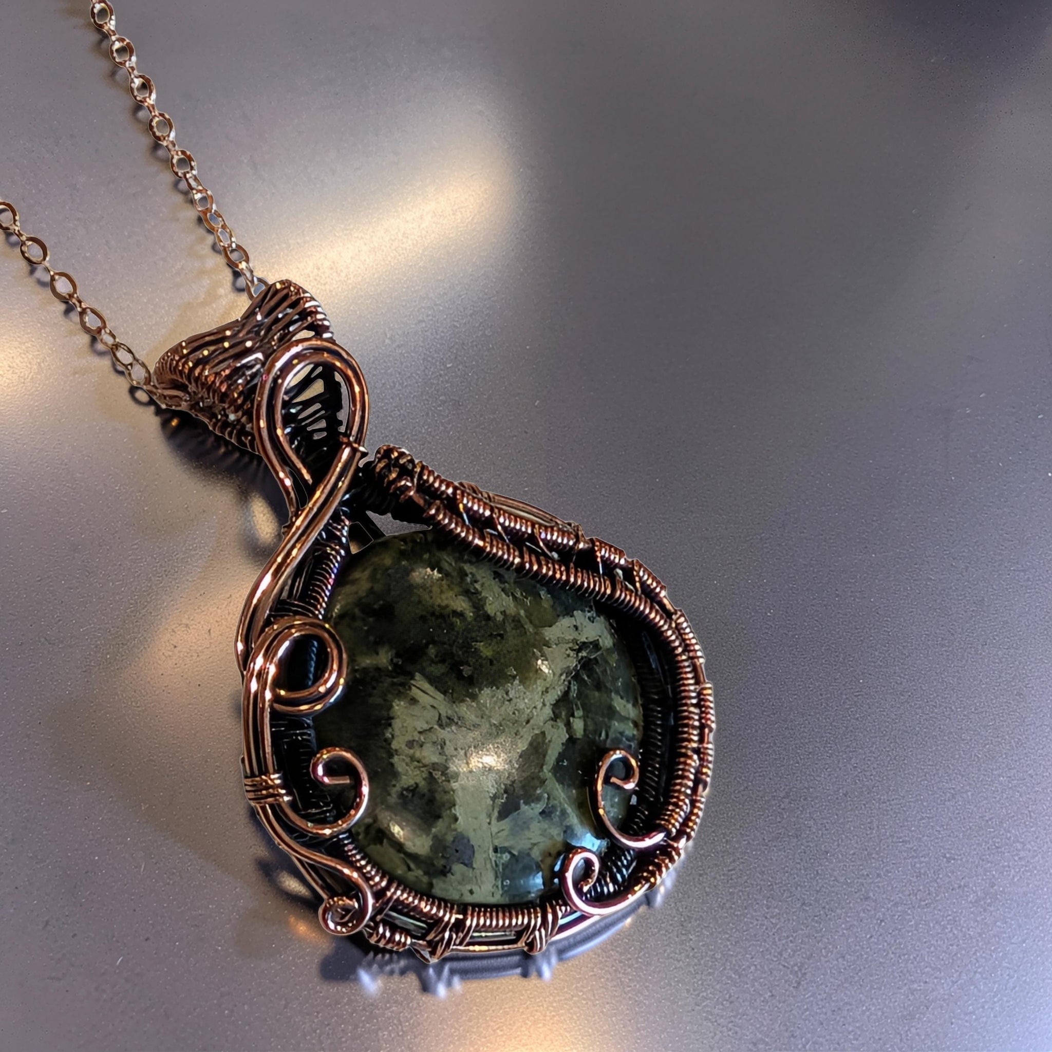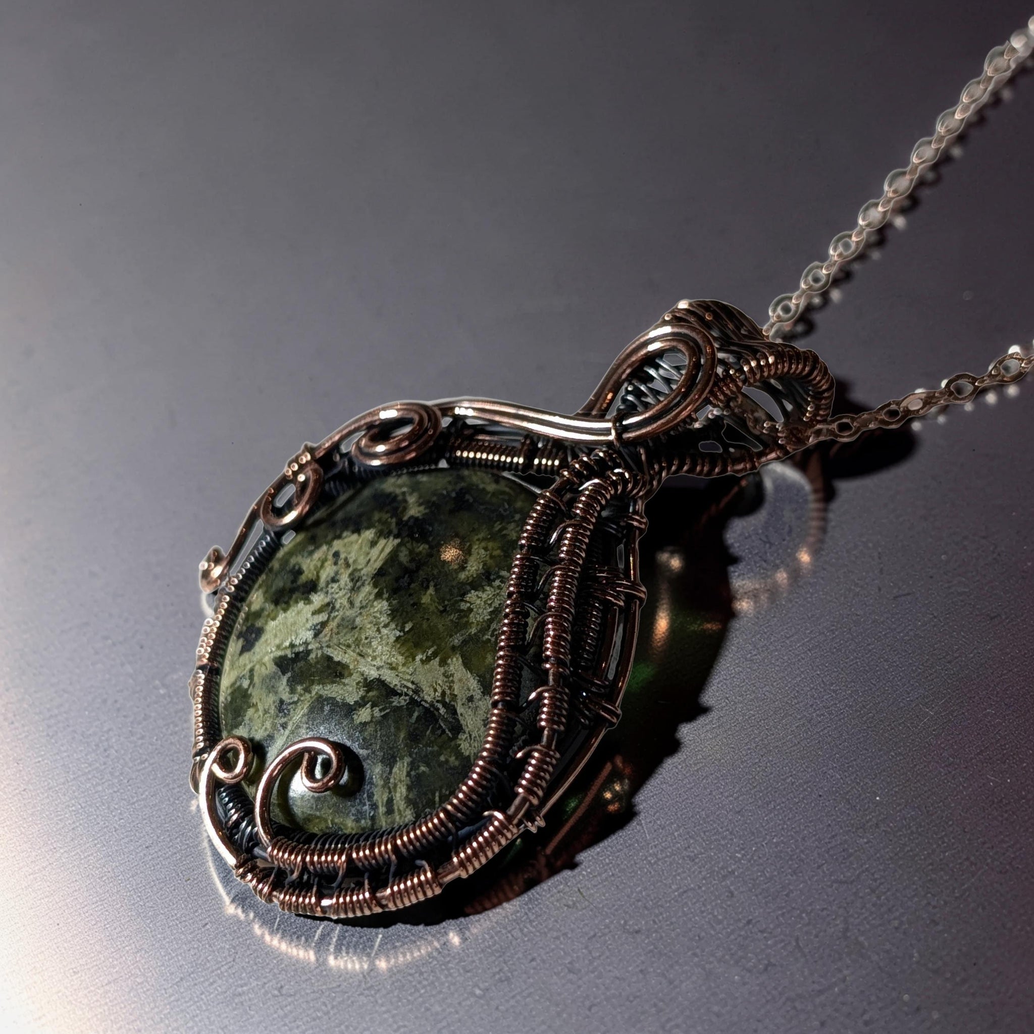 #EchoOfTheEarth #SerpentineJewelry #ArtisanPendant #WireWrappedArt #NatureInspired #HandcraftedJewelry #OneOfAKind #CopperArt