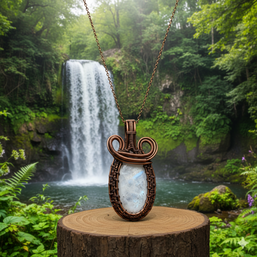 Discover the artistry in this one-of-a-kind, 2.2-inch pendant, an exquisite fusion of nature and meticulous craftsmanship. The deep, oxidized copper—a rich, near-black frame—serves as a compelling backdrop for the luminous oval moonstone. Each surface of the metal is intentionally woven and sculpted, culminating in a bail that showcases the rustic, organic texture of the wire-wrapping technique.