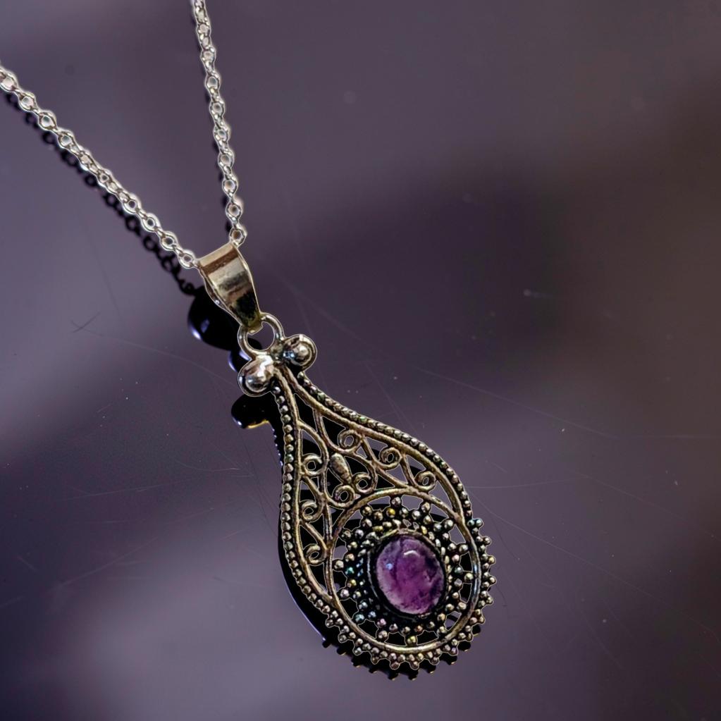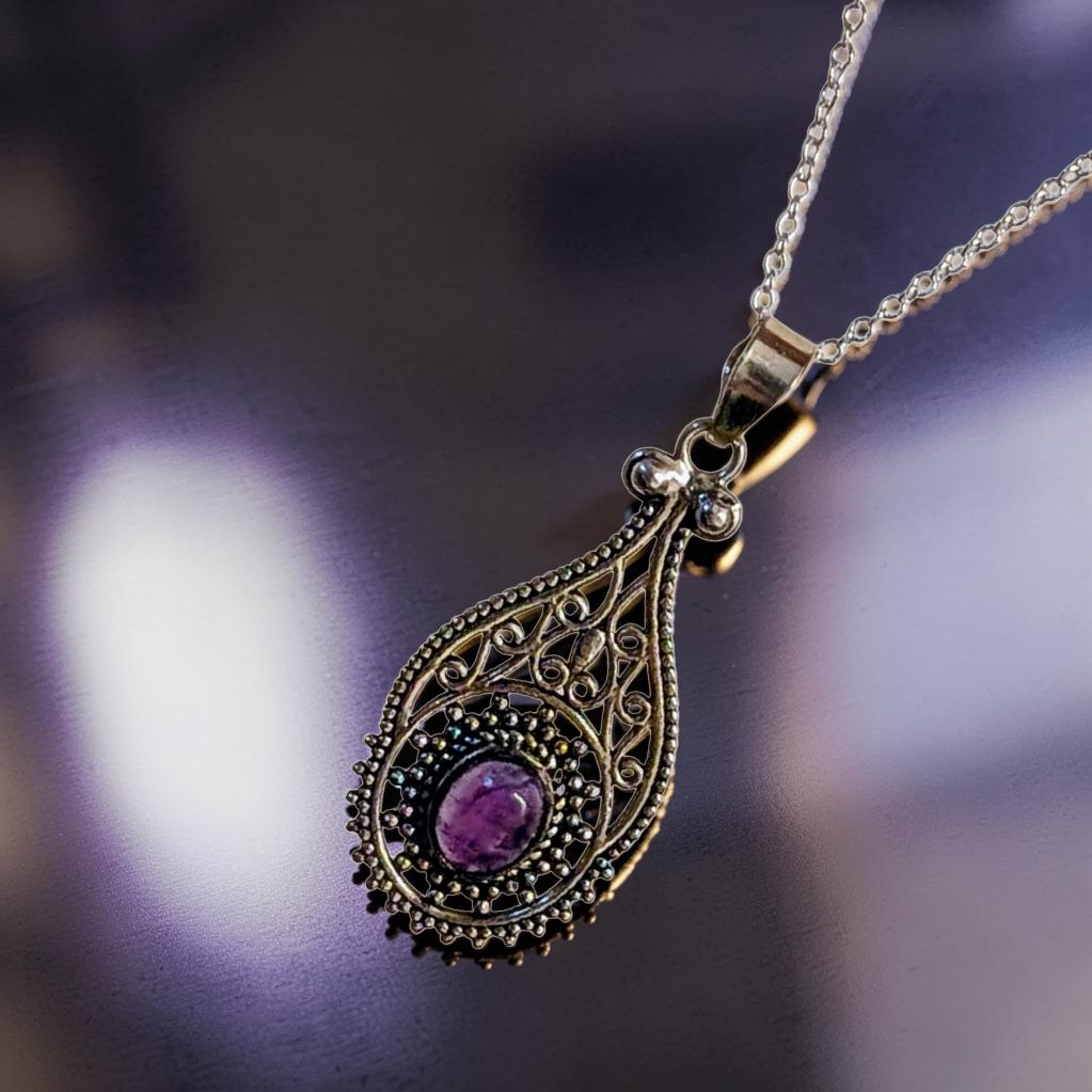 At the heart of the piece lies a vibrant amethyst cabochon, a stone long celebrated for its ability to bring peace to a restless mind and clarity to the spirit. The deep violet gemstone is cradled within an intricate teardrop of 925 sterling silver filigree, featuring delicate scrollwork and beaded textures that evoke a sense of vintage wonder.