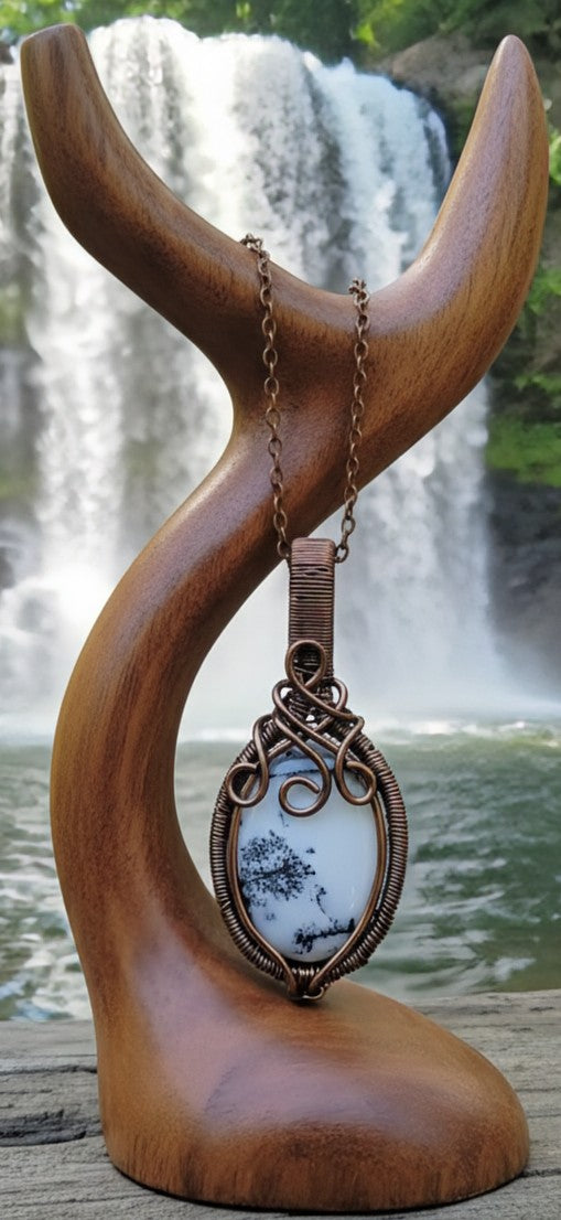 Inside a meticulously hand-woven copper wire cage sits a genuine Dendrite Opal. Look closely—those beautiful fern patterns aren't just stunning, they symbolize growth, nature’s connection, and spiritual transformation. There is no glue, no solder, just pure, secure craftsmanship.