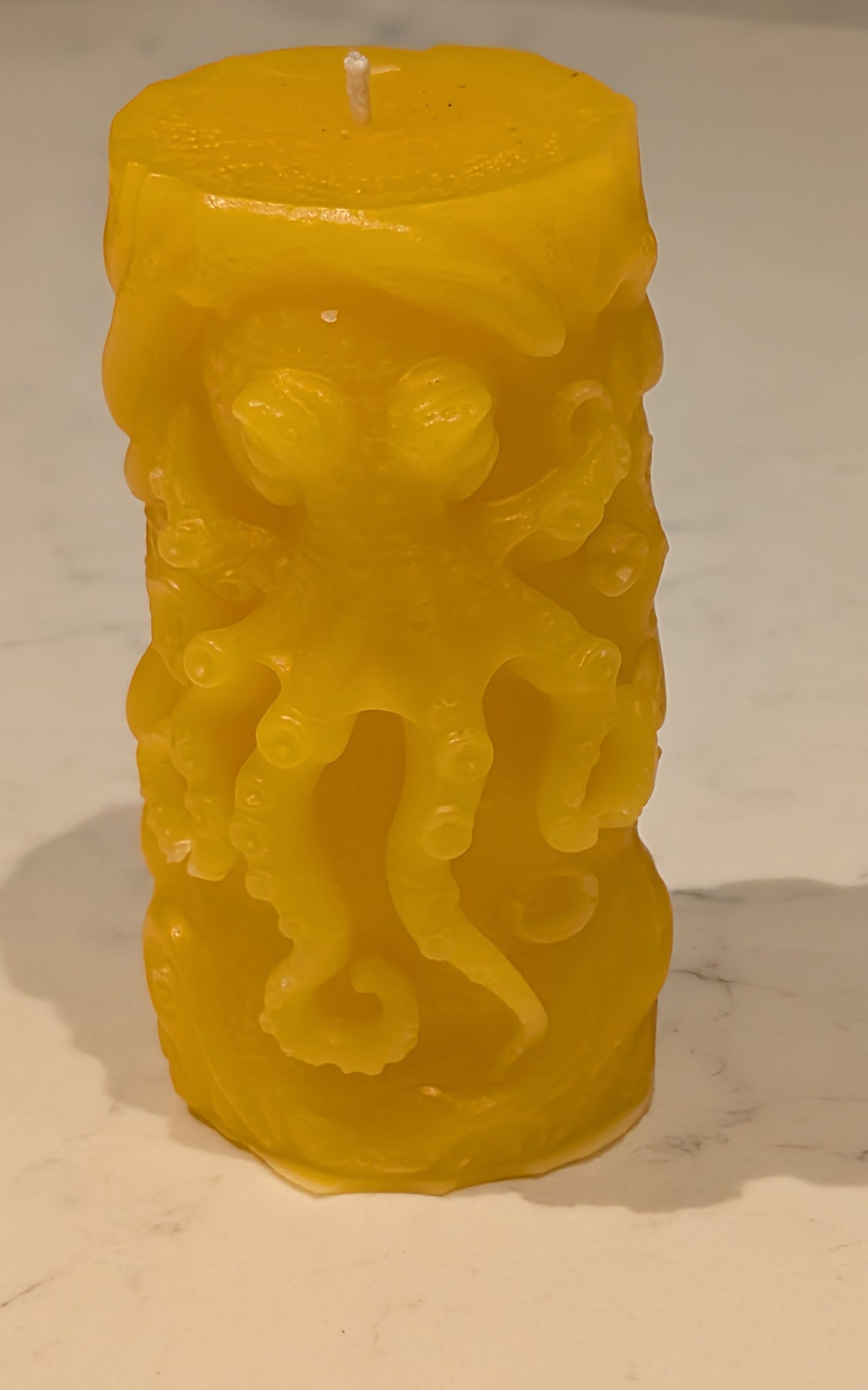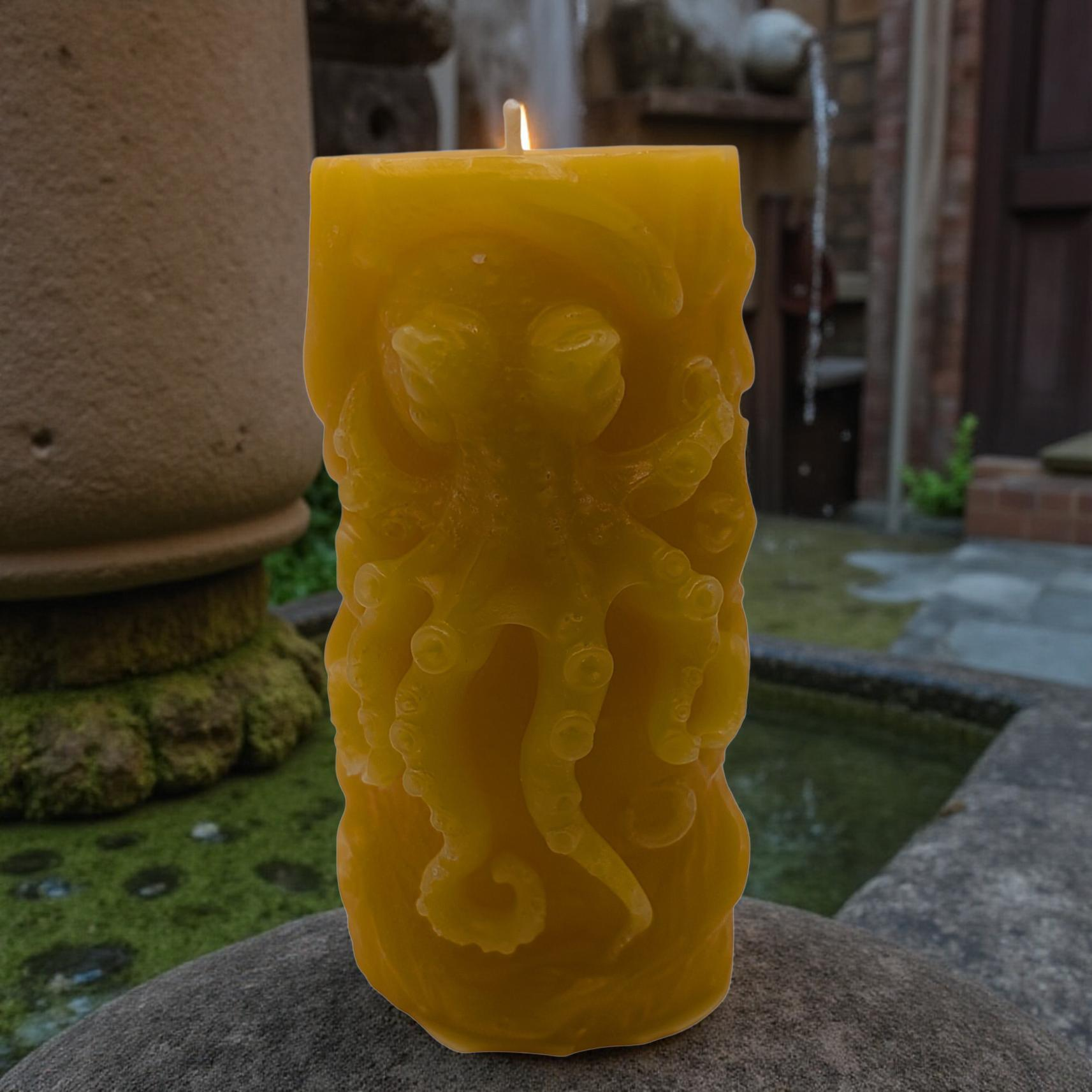 Hand-poured on Vancouver Island from 100\% organic beeswax, this 4.5'' \times 2'' pillar is a tribute to the ocean's most enigmatic creature. A meticulously sculpted octopus coils around the side, its texture contrasting beautifully with the candle's surface. That surface isn't smooth—it is intentionally uneven, bearing a rustic, dripped finish that speaks to its handmade, artisanal origin and gives it an ancient, unearthed quality. It embodies the octopus's symbolism of transformation and renewal—a vessel of natural light and profound meaning.