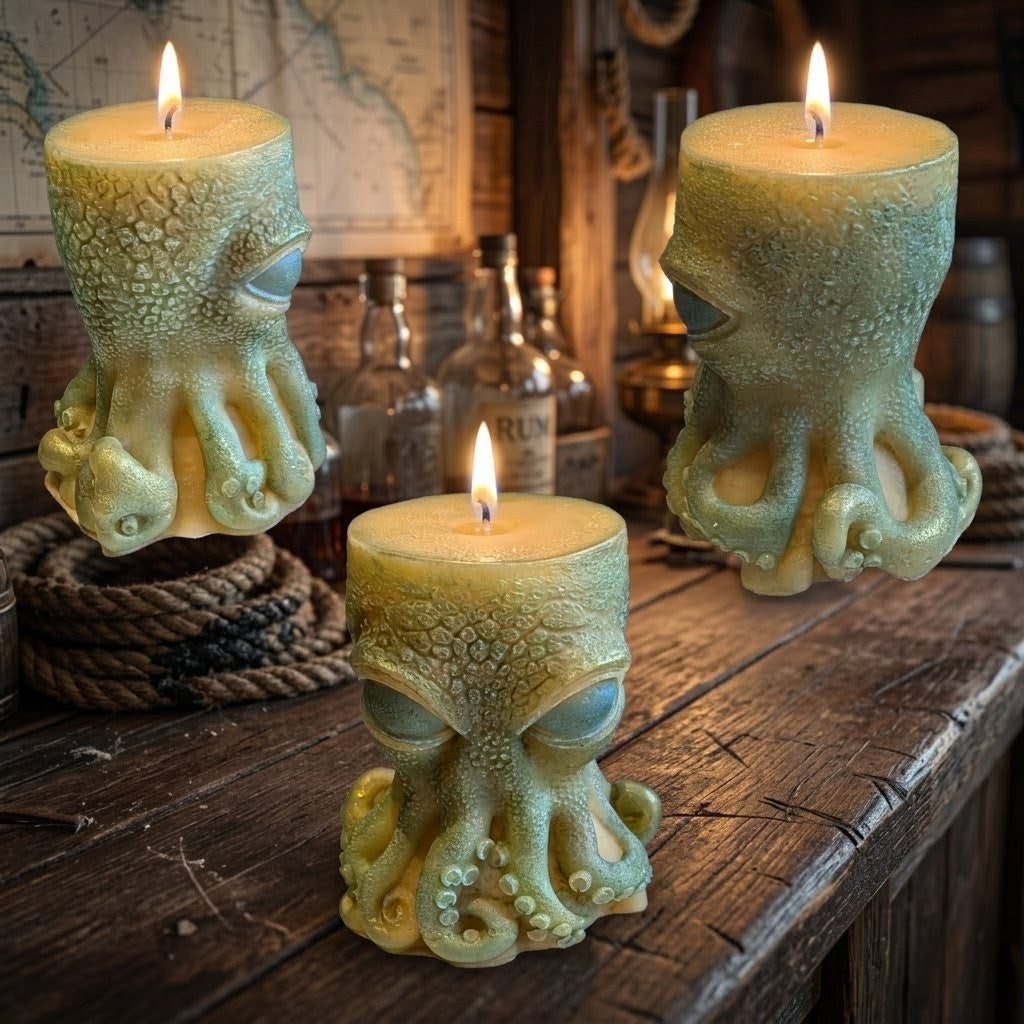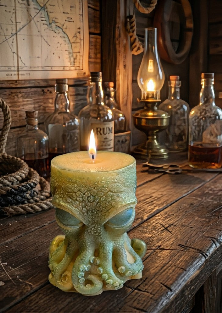 The candle features a detailed, hand-painted finish that captures the fluid movement and unique texture of the octopus. From the curious eyes to the reaching tentacles, the soft green and golden tones make this a standout piece for any nature lover or ocean enthusiast.