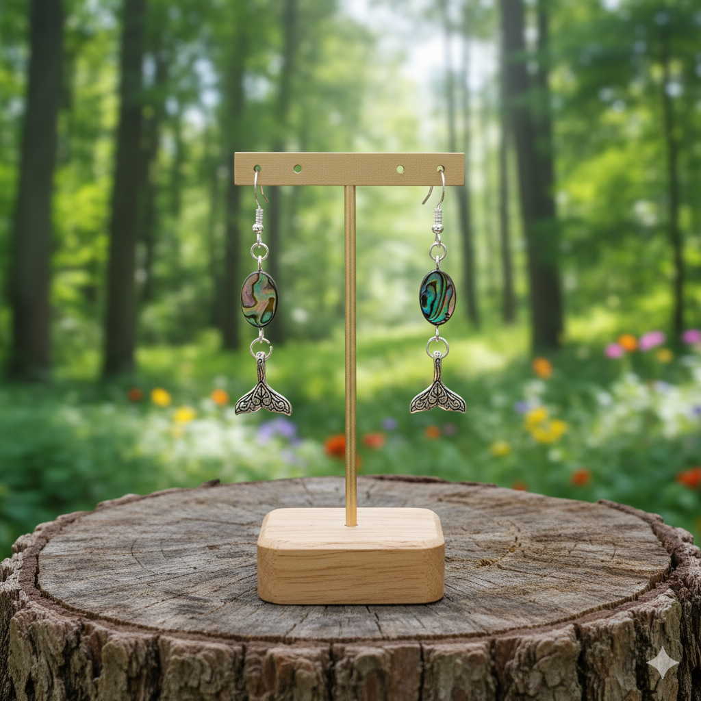 Embrace the serene beauty of the Pacific Northwest with these handcrafted earrings. The iridescent abalone shell, with its swirling, pearlescent hues, captures the spirit of the ocean's depths, while a meticulously engraved orca tail charm honors the strength and loyalty of these magnificent creatures.