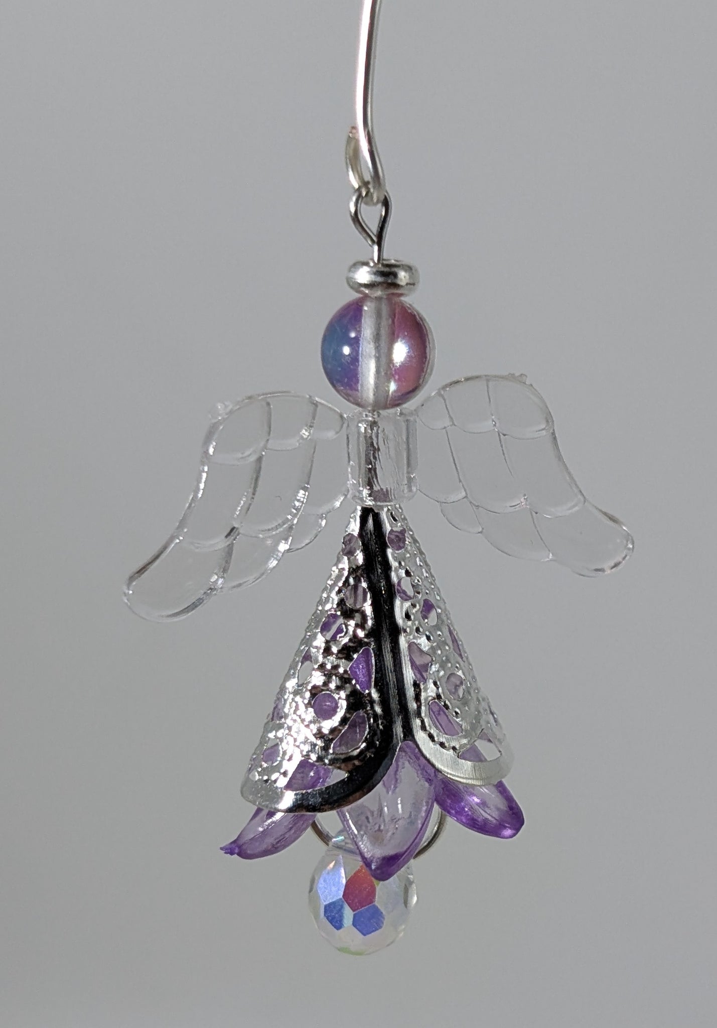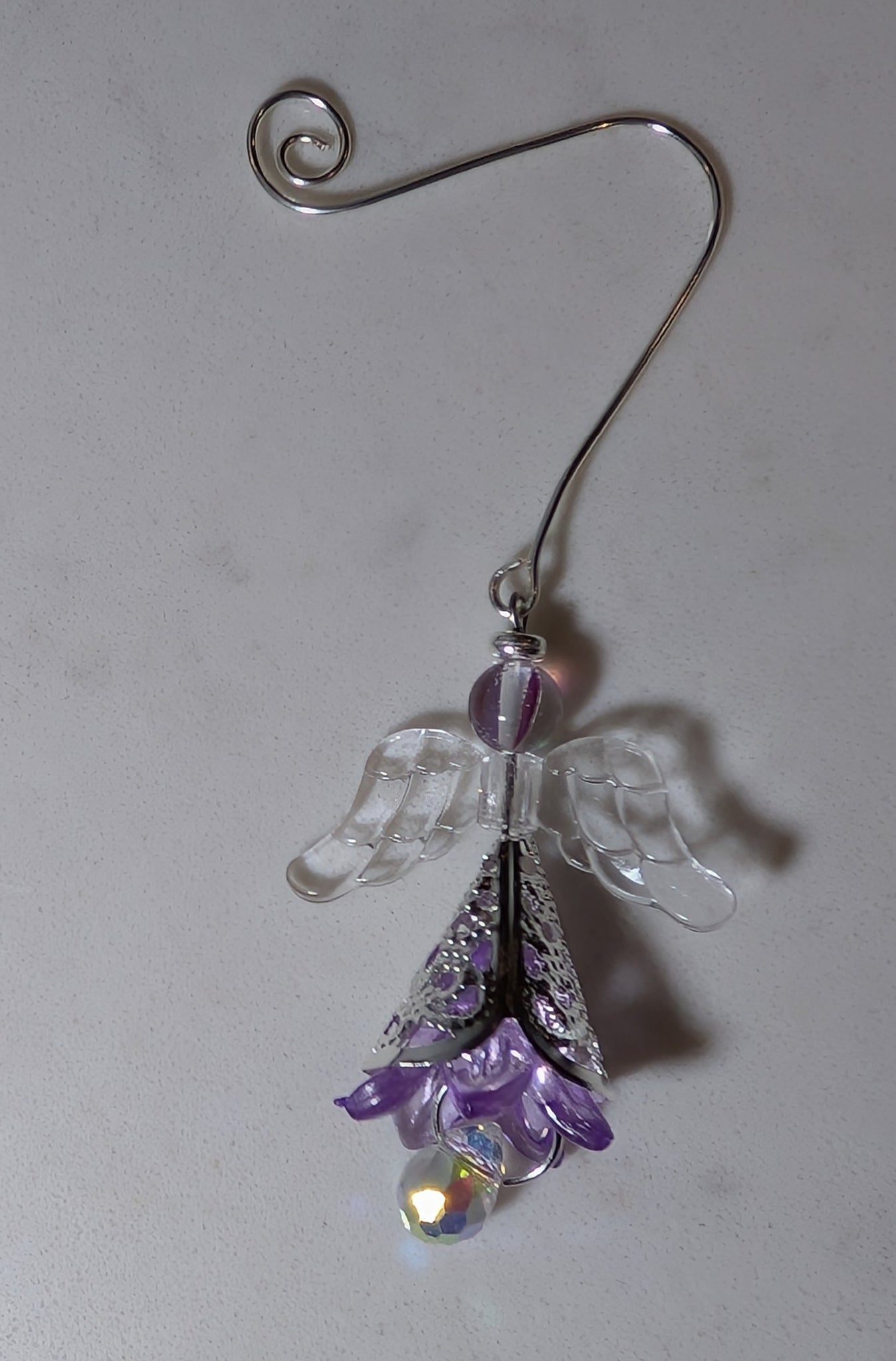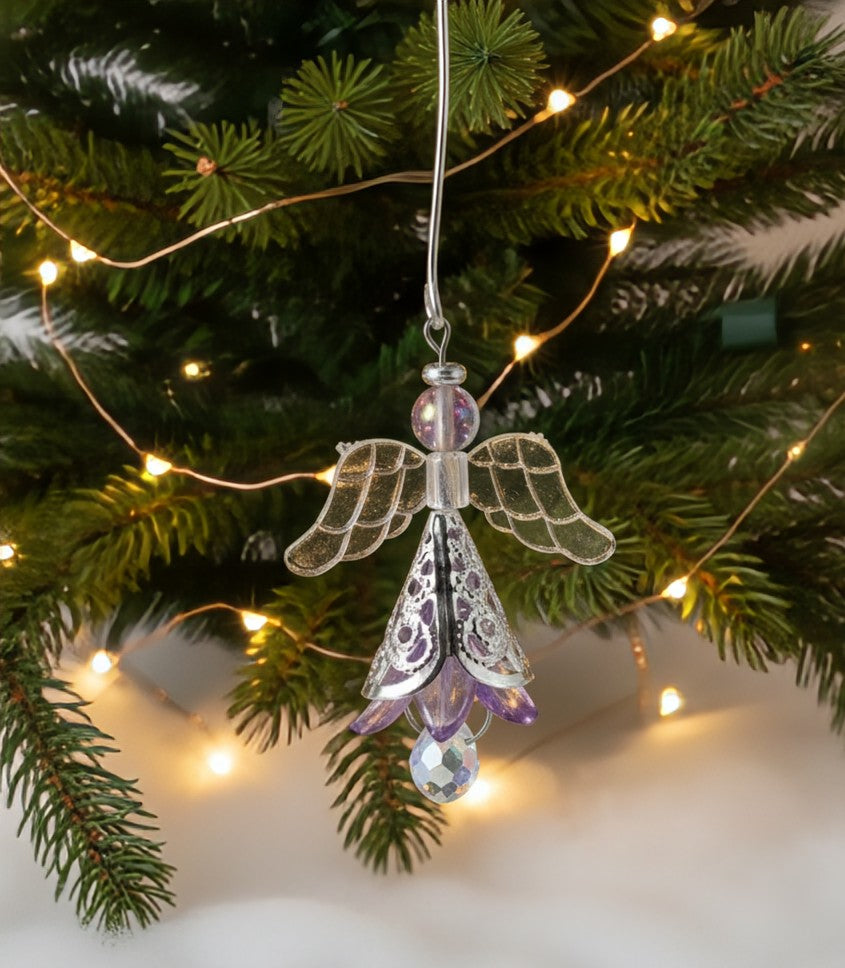 • The Details: Features a sparkling glass bell body, delicate silver filigree skirt, translucent wings, and a stunning Lavender Aura Quartz stone head. It measures 3.2 inches (from hook to prism tip).