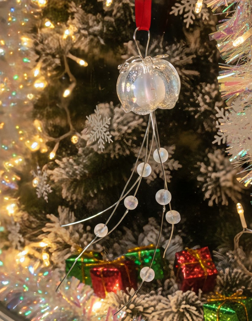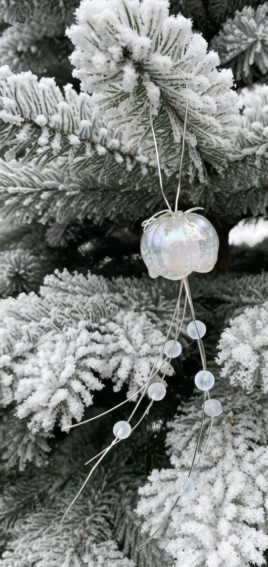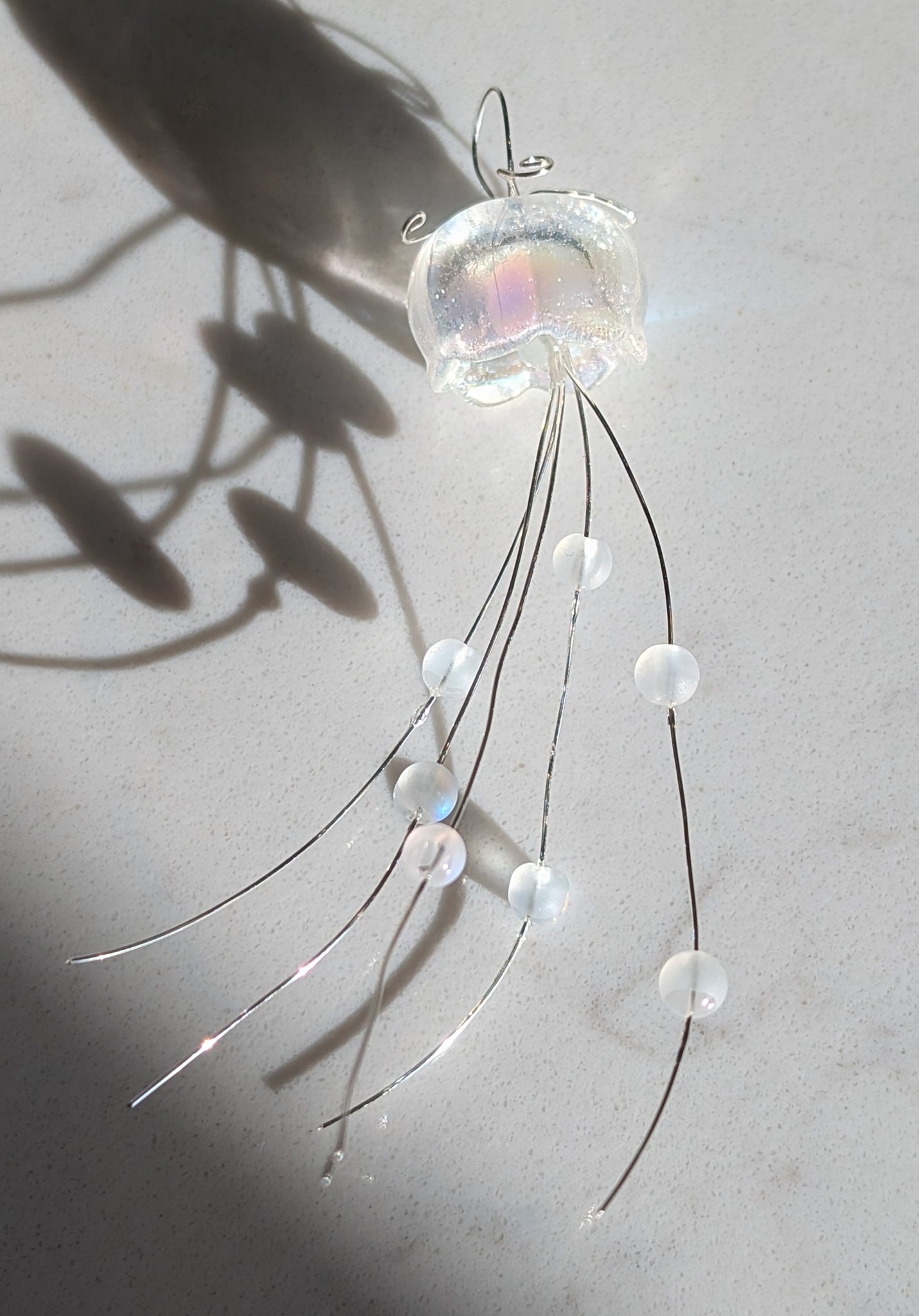 Handcrafted right here on Vancouver Island, our iridescent  3 Inch Jellyfish ornaments or sun catchers are more than just decor—they are a lesson in grace. Featuring a shimmering glass bell and frosted Angel Aura Quartz, these pieces turn every ray of sunlight into a dance of rainbows.