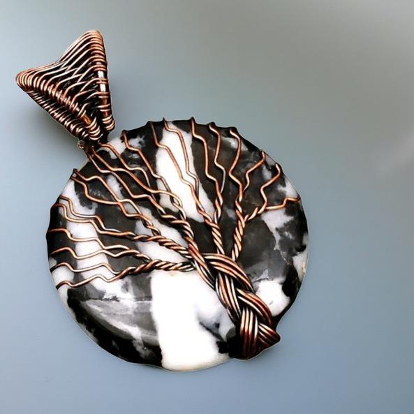 A striking pendant marries metaphysical power with intricate artistry. A generously sized, 1.8-inch Zebra Jasper stone—a bold mosaic of black and white—is lovingly encased in a hand-worked copper wire sculpture. The copper forms the magnificent 'tree of life' motif; its trunk and branches are woven in detailed relief, contrasting beautifully against the stone's graphic stripes.