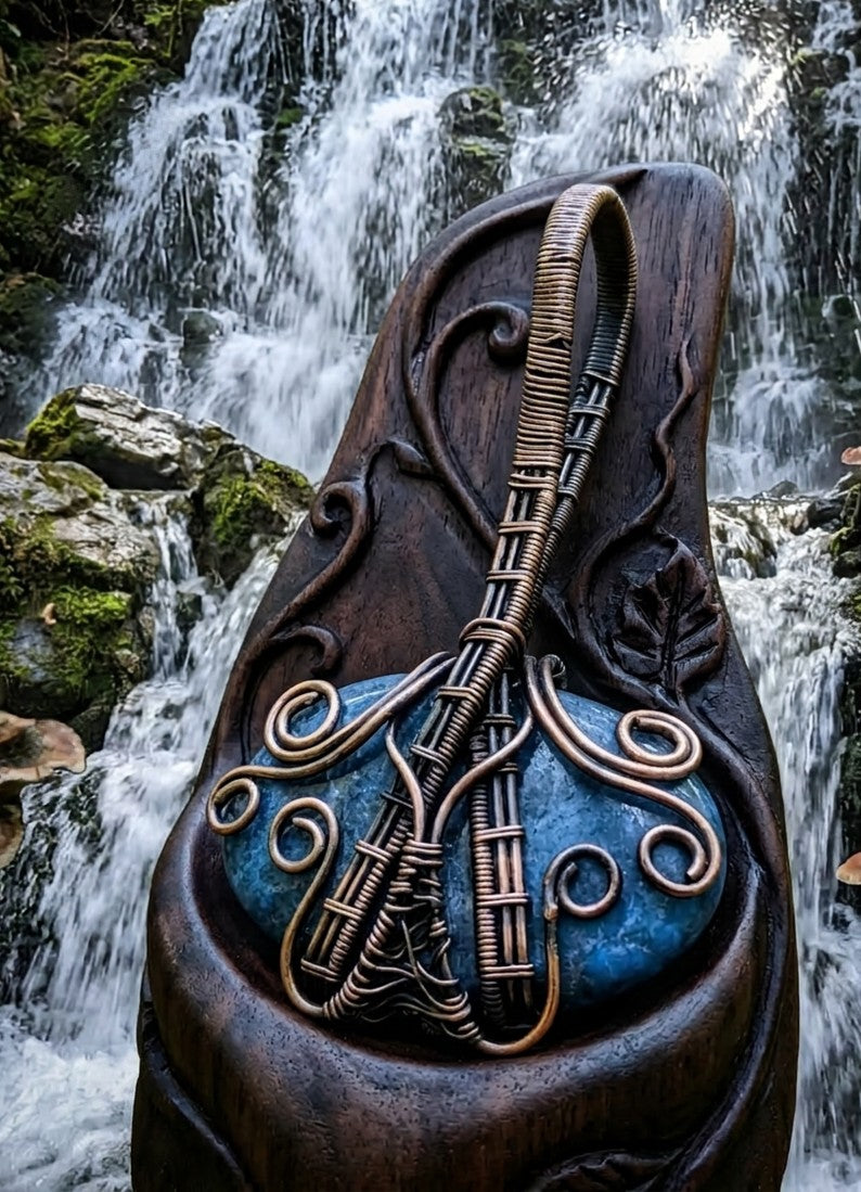 Imagine a fragment of the ancient sky, captured in a dance of burnished copper. This 3-inch talisman isn’t just jewelry; it’s a sculpted testament to nature’s profound artistry. At its heart lies deep-blue Apatite, the legendary "Stone of Truth." Like a glacial lake held in a warm, copper embrace, its cool azure depths contrast beautifully with hand-forged spirals that seem to pulse with life.