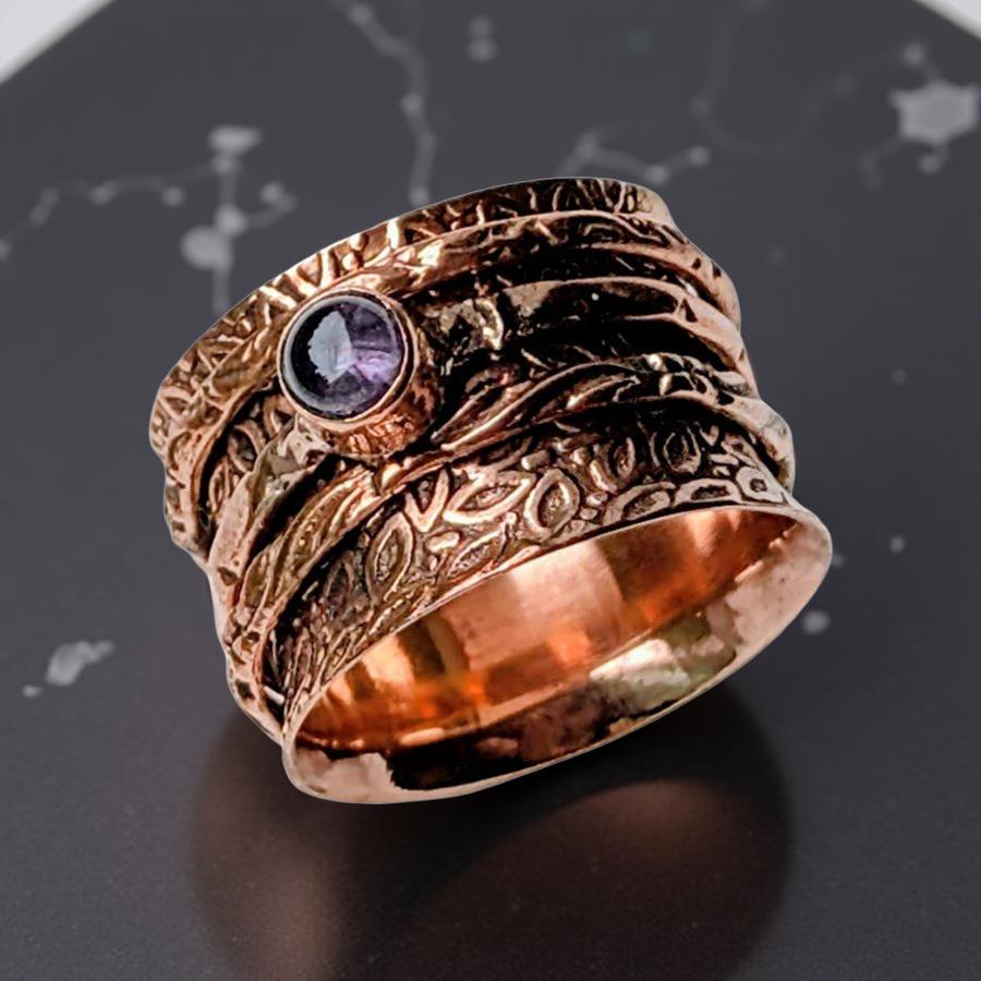 A whisper of elegance for your hand, this size 10 spinner ring is a beautiful convergence of materials and meaning. Crafted from 925 sterling silver, its surface is delicately plated with copper, providing a warm, earthy contrast. At its heart lies a single, captivating amethyst stone.