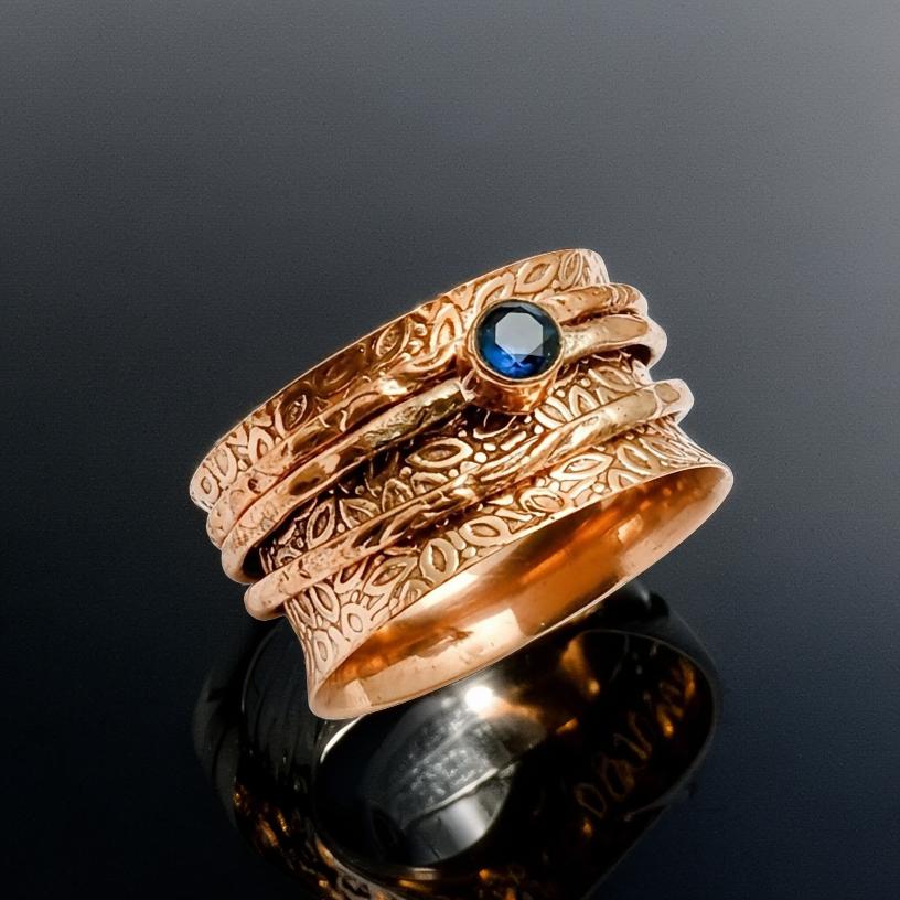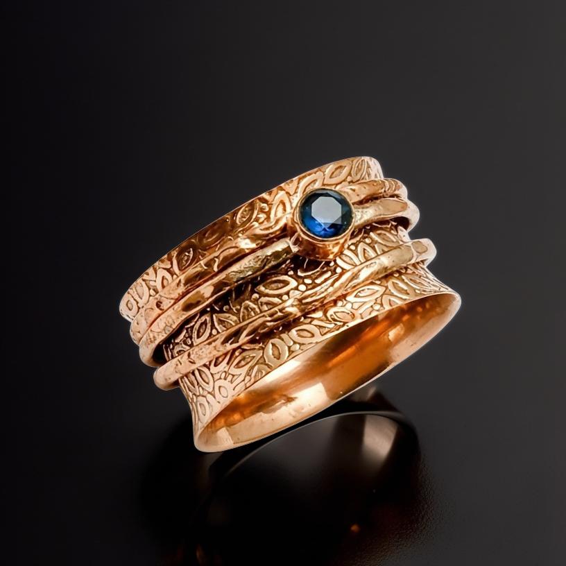 Our newest handcrafted meditation ring captures this rare, high-vibrational energy. A faceted tanzanite—reflective of a twilight sky—dances atop a wide band of warm, floral-embossed copper. Designed as a functional tool for mindfulness, three independent outer bands provide a rhythmic sensory experience, helping you navigate moments of anxiety with spiritual insight and grounded grace.