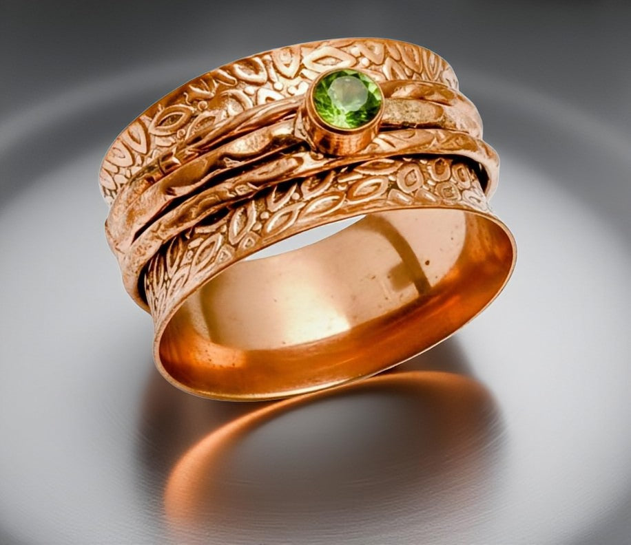 This handcrafted spinner ring unites the earthy warmth of copper with the vibrant energy of peridot. Set against a textured band that evokes the intricate beauty of the natural world, every detail tells a story of craftsmanship and intent.