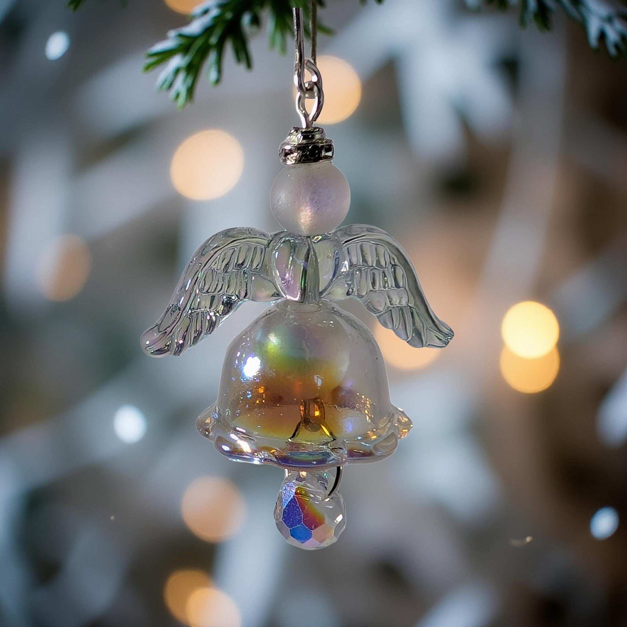 The ornament measures approximately 3.3 inches tall from hook to bottom of prism and is beautifully crafted with delicate, shimmering wings and a gentle opalescent acrylic bottom. Its true magic lies within: a suspended piece of Angel Aura Quartz. This magnificent, prismatic stone is believed to be a master alchemist, capable of transforming heavy emotional burdens into effortless tranquility and light. Each ray of sun it captures is a reflection of its power, turning any stress into a radiant, hopeful glow.