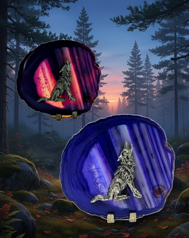 Mounted on a pewter tea light stand, the elegant, howling Wolf silhouette stands as a guide, embodying intelligence, inner wisdom, and primal instinct. This piece harmonizes the wolf's protective and loyal energy with the agate's power to awaken the Third Eye and Crown Chakras.