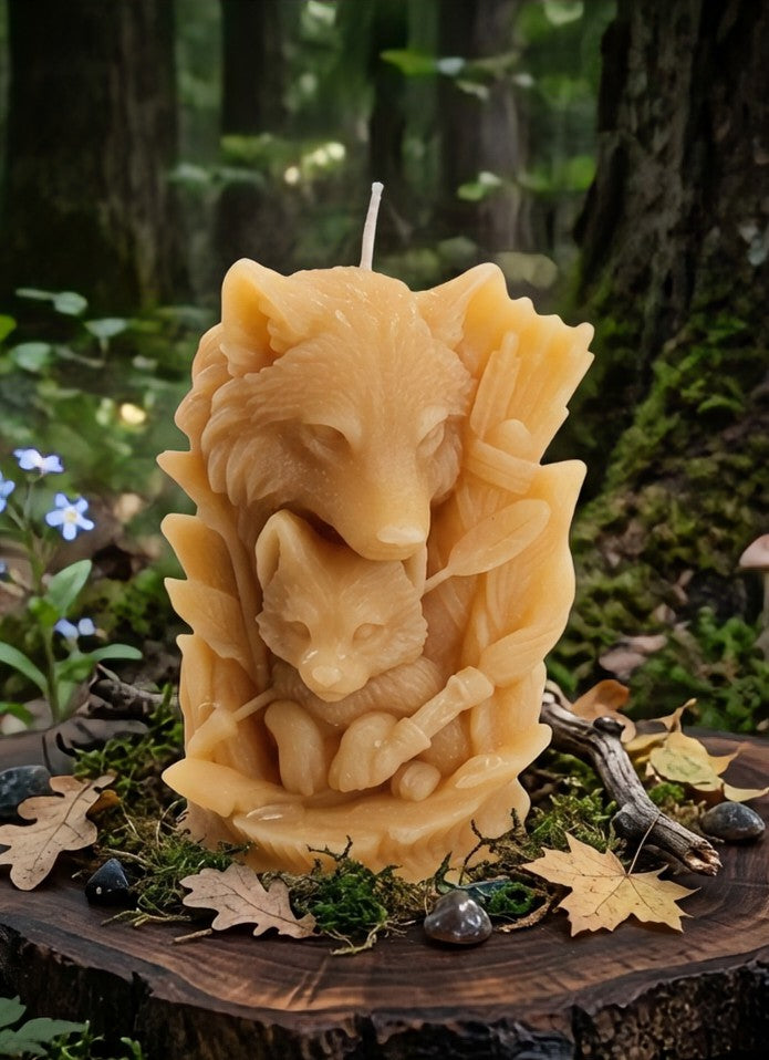 Strength and serenity meet in this hand-poured beeswax pillar. A tribute to the spirit of the pack, this piece honors the loyalty, deep intuition, and fierce protection of the wolf. The design depicts a powerful guardian sheltering a pup, surrounded by the natural textures of the forest, from the fine detail of the fur to the delicate leaves and feathers framing the scene.