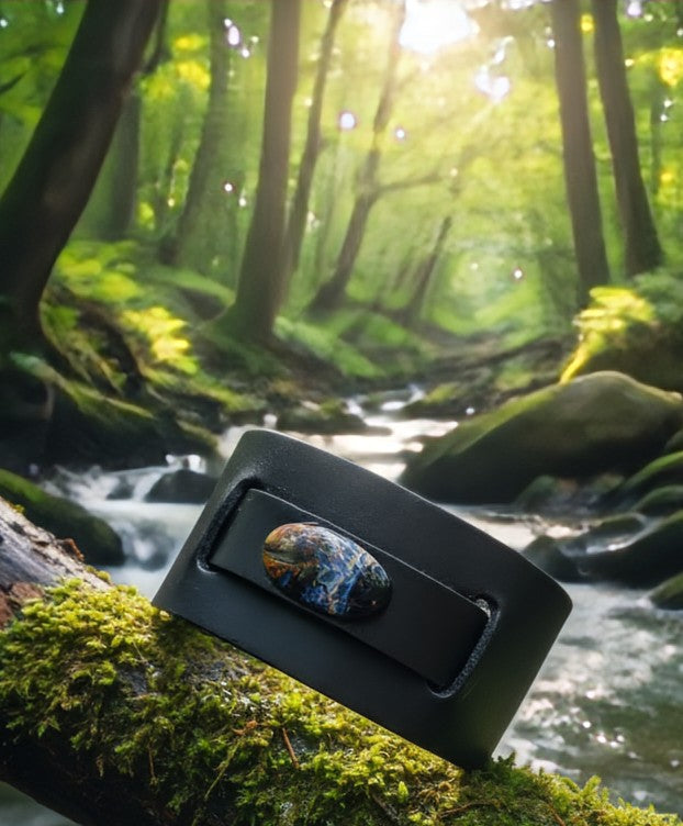 Harness the liberating power of Pietersite and the wolf's wisdom with this rugged and stylish black leather cuff bracelet.