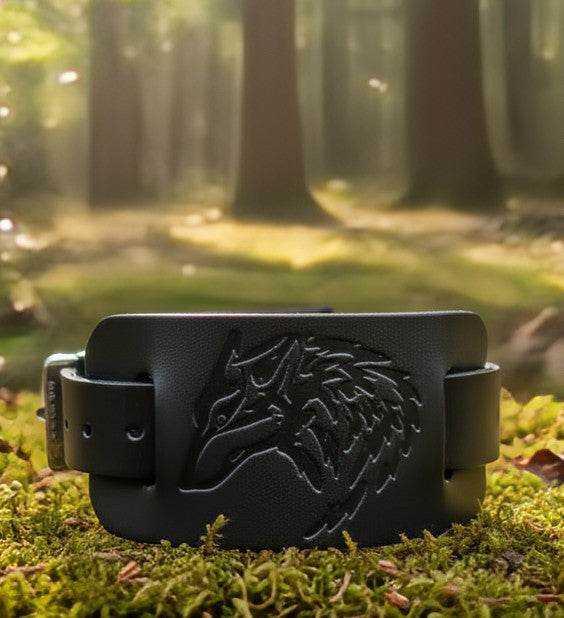 Flanking the stone, the substantial black leather cuff is intricately carved with stylized wolf heads, emphasizing the value of strong bonds and collective growth. The bracelet fastens securely with a buckle closure, underscoring its bold and substantial presence.