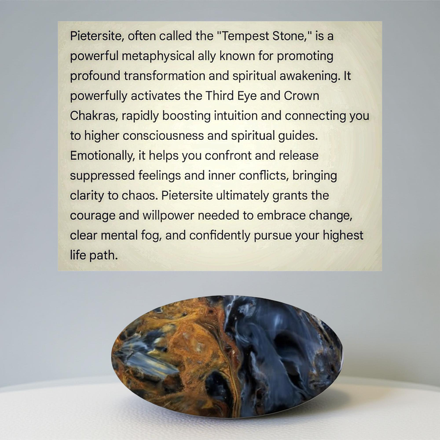 A distinctive central oval cabochon Pietersite anchors the design, showcasing a striking, stormy pattern of colors—deep blues, golds, and rusty browns—characteristic of this beloved "tempest stone." Known for its mesmerizing chatoyancy (a shimmering, silky effect), the stone is said to clear your path and guide you toward positive transformation.